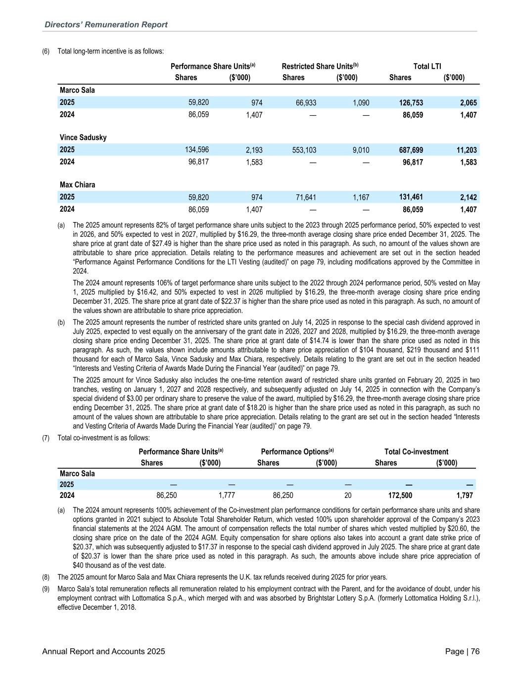 (6) Total long-term incentive is as follows: Performance Share Units(a) Restricted Share Units(b) Total LTI Shares ($’000) Shares ($’000) Shares ($’000) Marco Sala 2025 59,820 974 66,933 1,090 126,753 2,065 2024 86,059 1,407 — — 86,059 1,407 Vince Sadusky 2025 134,596 2,193 553,103 9,010 687,699 11,203 2024 96,817 1,583 — — 96,817 1,583 Max Chiara 2025 59,820 974 71,641 1,167 131,461 2,142 2024 86,059 1,407 — — 86,059 1,407 (a) The 2025 amount represents 82% of target performance share units subject to the 2023 through 2025 performance period, 50% expected to vest in 2026, and 50% expected to vest in 2027, multiplied by $16.29, the three-month average closing share price ended December 31, 2025. The share price at grant date of $27.49 is higher than the share price used as noted in this paragraph. As such, no amount of the values shown are attributable to share price appreciation. Details relating to the performance measures and achievement are set out in the section headed “Performance Against Performance Conditions for the LTI Vesting (audited)” on page 79, including modifications approved by the Committee in 2024. The 2024 amount represents 106% of target performance share units subject to the 2022 through 2024 performance period, 50% vested on May 1, 2025 multiplied by $16.42, and 50% expected to vest in 2026 multiplied by $16.29, the three-month average closing share price ending December 31, 2025. The share price at grant date of $22.37 is higher than the share price used as noted in this paragraph. As such, no amount of the values shown are attributable to share price appreciation. (b) The 2025 amount represents the number of restricted share units granted on July 14, 2025 in response to the special cash dividend approved in July 2025, expected to vest equally on the anniversary of the grant date in 2026, 2027 and 2028, multiplied by $16.29, the three-month average closing share price ending December 31, 2025. The share price at grant date of $14.74 is lower than the share price used as noted in this paragraph. As such, the values shown include amounts attributable to share price appreciation of $104 thousand, $219 thousand and $111 thousand for each of Marco Sala, Vince Sadusky and Max Chiara, respectively. Details relating to the grant are set out in the section headed “Interests and Vesting Criteria of Awards Made During the Financial Year (audited)” on page 79. The 2025 amount for Vince Sadusky also includes the one-time retention award of restricted share units granted on February 20, 2025 in two tranches, vesting on January 1, 2027 and 2028 respectively, and subsequently adjusted on July 14, 2025 in connection with the Company’s special dividend of $3.00 per ordinary share to preserve the value of the award, multiplied by $16.29, the three-month average closing share price ending December 31, 2025. The share price at grant date of $18.20 is higher than the share price used as noted in this paragraph, as such no amount of the values shown are attributable to share price appreciation. Details relating to the grant are set out in the section headed “Interests and Vesting Criteria of Awards Made During the Financial Year (audited)” on page 79. (7) Total co-investment is as follows: Performance Share Units(a) Performance Options(a) Total Co-investment Shares ($’000) Shares ($’000) Shares ($’000) Marco Sala 2025 — — — — — — 2024 86,250 1,777 86,250 20 172,500 1,797 (a) The 2024 amount represents 100% achievement of the Co-investment plan performance conditions for certain performance share units and share options granted in 2021 subject to Absolute Total Shareholder Return, which vested 100% upon shareholder approval of the Company’s 2023 financial statements at the 2024 AGM. The amount of compensation reflects the total number of shares which vested multiplied by $20.60, the closing share price on the date of the 2024 AGM. Equity compensation for share options also takes into account a grant date strike price of $20.37, which was subsequently adjusted to $17.37 in response to the special cash dividend approved in July 2025. The share price at grant date of $20.37 is lower than the share price used as noted in this paragraph. As such, the amounts above include share price appreciation of $40 thousand as of the vest date. (8) The 2025 amount for Marco Sala and Max Chiara represents the U.K. tax refunds received during 2025 for prior years. (9) Marco Sala’s total remuneration reflects all remuneration related to his employment contract with the Parent, and for the avoidance of doubt, under his employment contract with Lottomatica S.p.A., which merged with and was absorbed by Brightstar Lottery S.p.A. (formerly Lottomatica Holding S.r.l.), effective December 1, 2018. Directors’ Remuneration Report Annual Report and Accounts 2025 Page | 76