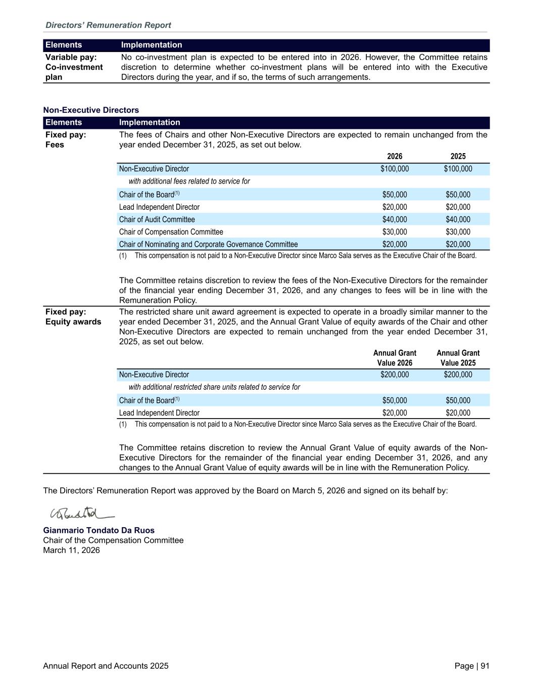 Variable pay: Co-investment plan No co-investment plan is expected to be entered into in 2026. However, the Committee retains discretion to determine whether co-investment plans will be entered into with the Executive Directors during the year, and if so, the terms of such arrangements. Elements Implementation Non-Executive Directors Fixed pay: Fees The fees of Chairs and other Non-Executive Directors are expected to remain unchanged from the year ended December 31, 2025, as set out below. 2026 2025 Non-Executive Director $100,000 $100,000 with additional fees related to service for Chair of the Board(1) $50,000 $50,000 Lead Independent Director $20,000 $20,000 Chair of Audit Committee $40,000 $40,000 Chair of Compensation Committee $30,000 $30,000 Chair of Nominating and Corporate Governance Committee $20,000 $20,000 (1) This compensation is not paid to a Non-Executive Director since Marco Sala serves as the Executive Chair of the Board. The Committee retains discretion to review the fees of the Non-Executive Directors for the remainder of the financial year ending December 31, 2026, and any changes to fees will be in line with the Remuneration Policy. Fixed pay: Equity awards The restricted share unit award agreement is expected to operate in a broadly similar manner to the year ended December 31, 2025, and the Annual Grant Value of equity awards of the Chair and other Non-Executive Directors are expected to remain unchanged from the year ended December 31, 2025, as set out below. Annual Grant Value 2026 Annual Grant Value 2025 Non-Executive Director $200,000 $200,000 with additional restricted share units related to service for Chair of the Board(1) $50,000 $50,000 Lead Independent Director $20,000 $20,000 (1) This compensation is not paid to a Non-Executive Director since Marco Sala serves as the Executive Chair of the Board. The Committee retains discretion to review the Annual Grant Value of equity awards of the Non- Executive Directors for the remainder of the financial year ending December 31, 2026, and any changes to the Annual Grant Value of equity awards will be in line with the Remuneration Policy. Elements Implementation The Directors’ Remuneration Report was approved by the Board on March 5, 2026 and signed on its behalf by: Gianmario Tondato Da Ruos Chair of the Compensation Committee March 11, 2026 Directors’ Remuneration Report Annual Report and Accounts 2025 Page | 91