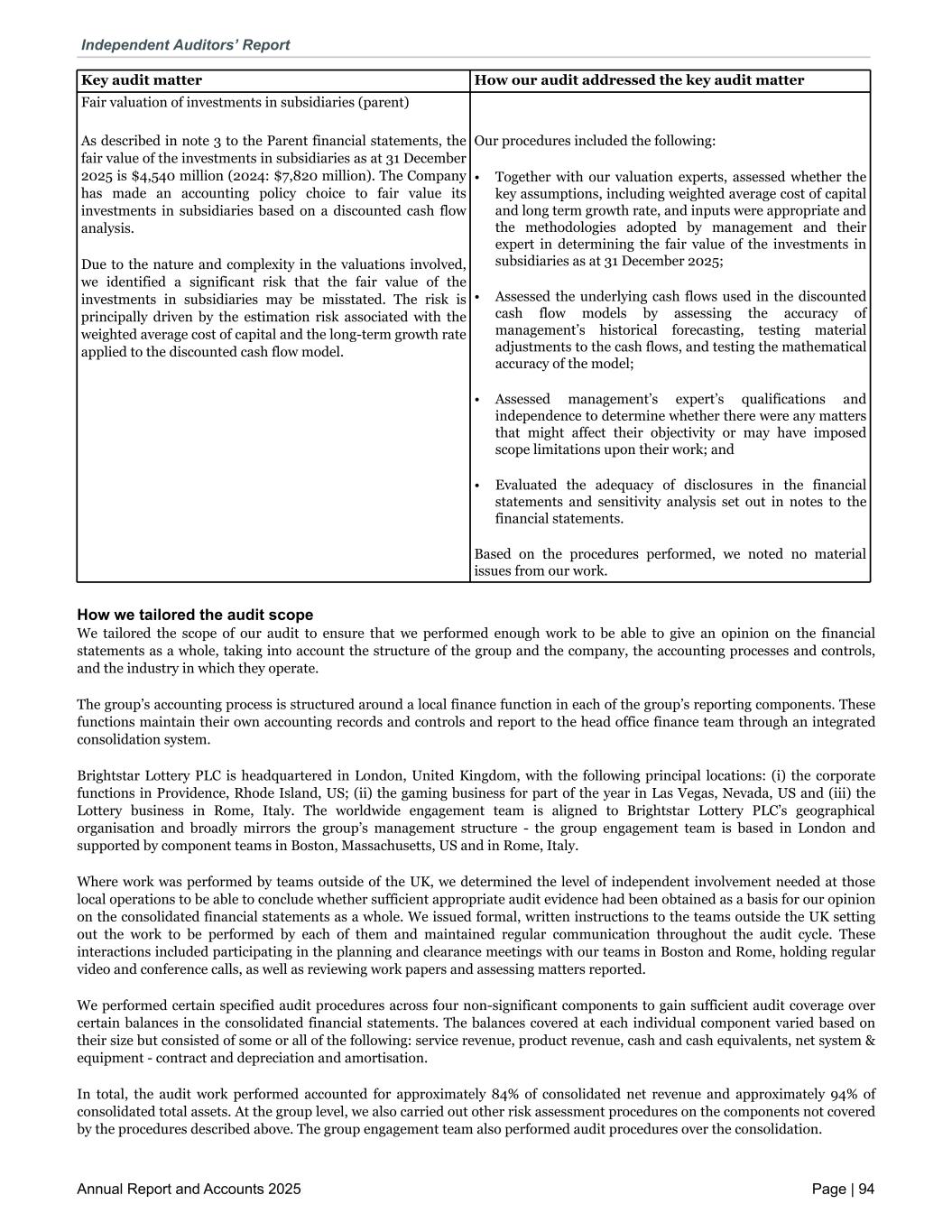 Fair valuation of investments in subsidiaries (parent) As described in note 3 to the Parent financial statements, the fair value of the investments in subsidiaries as at 31 December 2025 is $4,540 million (2024: $7,820 million). The Company has made an accounting policy choice to fair value its investments in subsidiaries based on a discounted cash flow analysis. Due to the nature and complexity in the valuations involved, we identified a significant risk that the fair value of the investments in subsidiaries may be misstated. The risk is principally driven by the estimation risk associated with the weighted average cost of capital and the long-term growth rate applied to the discounted cash flow model. Our procedures included the following: • Together with our valuation experts, assessed whether the key assumptions, including weighted average cost of capital and long term growth rate, and inputs were appropriate and the methodologies adopted by management and their expert in determining the fair value of the investments in subsidiaries as at 31 December 2025; • Assessed the underlying cash flows used in the discounted cash flow models by assessing the accuracy of management’s historical forecasting, testing material adjustments to the cash flows, and testing the mathematical accuracy of the model; • Assessed management’s expert’s qualifications and independence to determine whether there were any matters that might affect their objectivity or may have imposed scope limitations upon their work; and • Evaluated the adequacy of disclosures in the financial statements and sensitivity analysis set out in notes to the financial statements. Based on the procedures performed, we noted no material issues from our work. Key audit matter How our audit addressed the key audit matter How we tailored the audit scope We tailored the scope of our audit to ensure that we performed enough work to be able to give an opinion on the financial statements as a whole, taking into account the structure of the group and the company, the accounting processes and controls, and the industry in which they operate. The group’s accounting process is structured around a local finance function in each of the group’s reporting components. These functions maintain their own accounting records and controls and report to the head office finance team through an integrated consolidation system. Brightstar Lottery PLC is headquartered in London, United Kingdom, with the following principal locations: (i) the corporate functions in Providence, Rhode Island, US; (ii) the gaming business for part of the year in Las Vegas, Nevada, US and (iii) the Lottery business in Rome, Italy. The worldwide engagement team is aligned to Brightstar Lottery PLC’s geographical organisation and broadly mirrors the group’s management structure - the group engagement team is based in London and supported by component teams in Boston, Massachusetts, US and in Rome, Italy. Where work was performed by teams outside of the UK, we determined the level of independent involvement needed at those local operations to be able to conclude whether sufficient appropriate audit evidence had been obtained as a basis for our opinion on the consolidated financial statements as a whole. We issued formal, written instructions to the teams outside the UK setting out the work to be performed by each of them and maintained regular communication throughout the audit cycle. These interactions included participating in the planning and clearance meetings with our teams in Boston and Rome, holding regular video and conference calls, as well as reviewing work papers and assessing matters reported. We performed certain specified audit procedures across four non-significant components to gain sufficient audit coverage over certain balances in the consolidated financial statements. The balances covered at each individual component varied based on their size but consisted of some or all of the following: service revenue, product revenue, cash and cash equivalents, net system & equipment - contract and depreciation and amortisation. In total, the audit work performed accounted for approximately 84% of consolidated net revenue and approximately 94% of consolidated total assets. At the group level, we also carried out other risk assessment procedures on the components not covered by the procedures described above. The group engagement team also performed audit procedures over the consolidation. Independent Auditors’ Report Annual Report and Accounts 2025 Page | 94