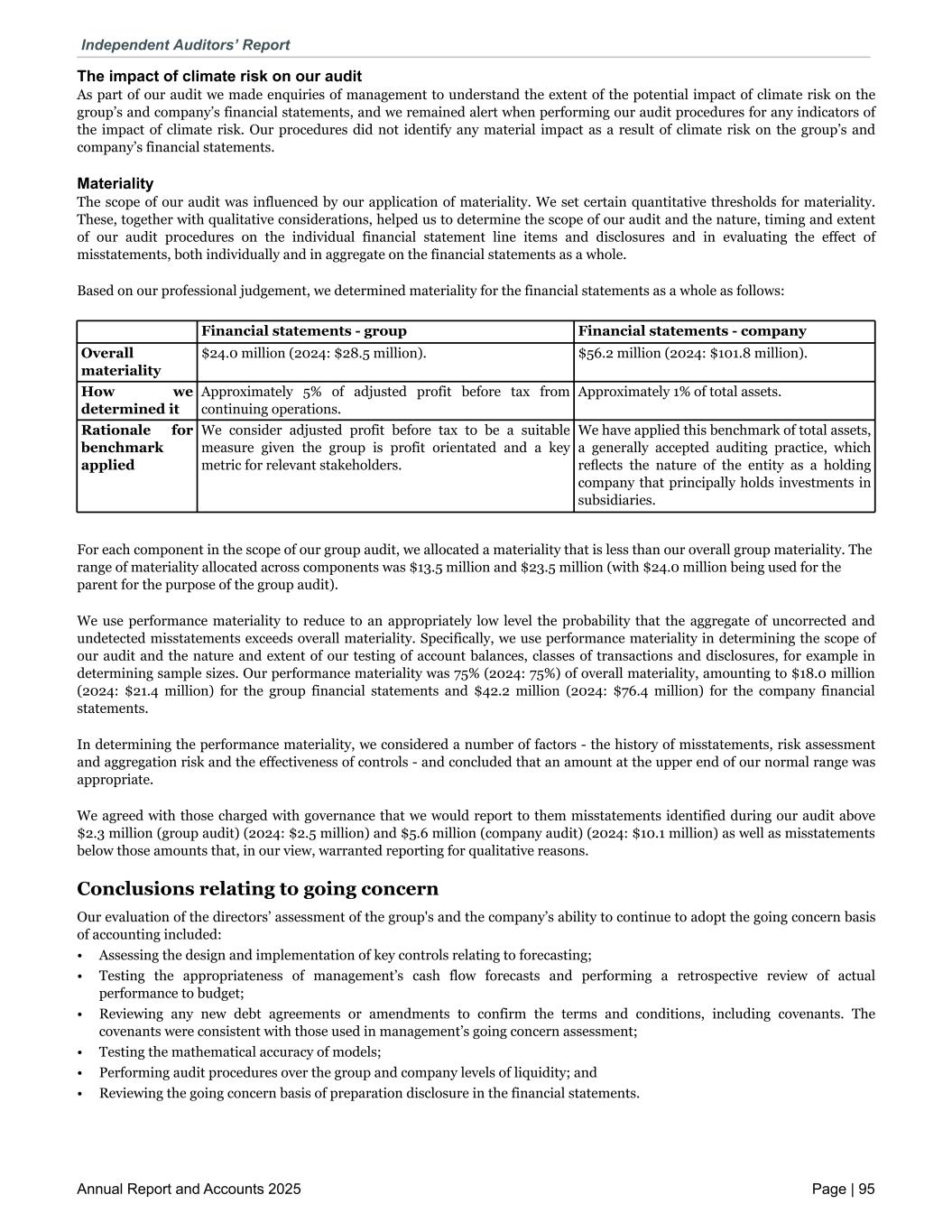 The impact of climate risk on our audit As part of our audit we made enquiries of management to understand the extent of the potential impact of climate risk on the group’s and company’s financial statements, and we remained alert when performing our audit procedures for any indicators of the impact of climate risk. Our procedures did not identify any material impact as a result of climate risk on the group’s and company’s financial statements. Materiality The scope of our audit was influenced by our application of materiality. We set certain quantitative thresholds for materiality. These, together with qualitative considerations, helped us to determine the scope of our audit and the nature, timing and extent of our audit procedures on the individual financial statement line items and disclosures and in evaluating the effect of misstatements, both individually and in aggregate on the financial statements as a whole. Based on our professional judgement, we determined materiality for the financial statements as a whole as follows: Financial statements - group Financial statements - company Overall materiality $24.0 million (2024: $28.5 million). $56.2 million (2024: $101.8 million). How we determined it Approximately 5% of adjusted profit before tax from continuing operations. Approximately 1% of total assets. Rationale for benchmark applied We consider adjusted profit before tax to be a suitable measure given the group is profit orientated and a key metric for relevant stakeholders. We have applied this benchmark of total assets, a generally accepted auditing practice, which reects the nature of the entity as a holding company that principally holds investments in subsidiaries. For each component in the scope of our group audit, we allocated a materiality that is less than our overall group materiality. The range of materiality allocated across components was $13.5 million and $23.5 million (with $24.0 million being used for the parent for the purpose of the group audit). We use performance materiality to reduce to an appropriately low level the probability that the aggregate of uncorrected and undetected misstatements exceeds overall materiality. Specifically, we use performance materiality in determining the scope of our audit and the nature and extent of our testing of account balances, classes of transactions and disclosures, for example in determining sample sizes. Our performance materiality was 75% (2024: 75%) of overall materiality, amounting to $18.0 million (2024: $21.4 million) for the group financial statements and $42.2 million (2024: $76.4 million) for the company financial statements. In determining the performance materiality, we considered a number of factors - the history of misstatements, risk assessment and aggregation risk and the effectiveness of controls - and concluded that an amount at the upper end of our normal range was appropriate. We agreed with those charged with governance that we would report to them misstatements identified during our audit above $2.3 million (group audit) (2024: $2.5 million) and $5.6 million (company audit) (2024: $10.1 million) as well as misstatements below those amounts that, in our view, warranted reporting for qualitative reasons. Conclusions relating to going concern Our evaluation of the directors’ assessment of the group's and the company’s ability to continue to adopt the going concern basis of accounting included: • Assessing the design and implementation of key controls relating to forecasting; • Testing the appropriateness of management’s cash flow forecasts and performing a retrospective review of actual performance to budget; • Reviewing any new debt agreements or amendments to confirm the terms and conditions, including covenants. The covenants were consistent with those used in management’s going concern assessment; • Testing the mathematical accuracy of models; • Performing audit procedures over the group and company levels of liquidity; and • Reviewing the going concern basis of preparation disclosure in the financial statements. Independent Auditors’ Report Annual Report and Accounts 2025 Page | 95