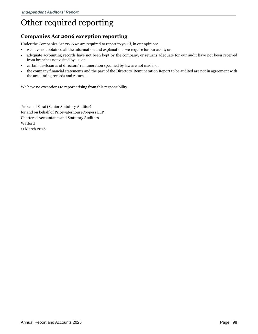 Other required reporting Companies Act 2006 exception reporting Under the Companies Act 2006 we are required to report to you if, in our opinion: • we have not obtained all the information and explanations we require for our audit; or • adequate accounting records have not been kept by the company, or returns adequate for our audit have not been received from branches not visited by us; or • certain disclosures of directors’ remuneration specified by law are not made; or • the company financial statements and the part of the Directors’ Remuneration Report to be audited are not in agreement with the accounting records and returns. We have no exceptions to report arising from this responsibility. Jaskamal Sarai (Senior Statutory Auditor) for and on behalf of PricewaterhouseCoopers LLP Chartered Accountants and Statutory Auditors Watford 11 March 2026 Independent Auditors’ Report Annual Report and Accounts 2025 Page | 98