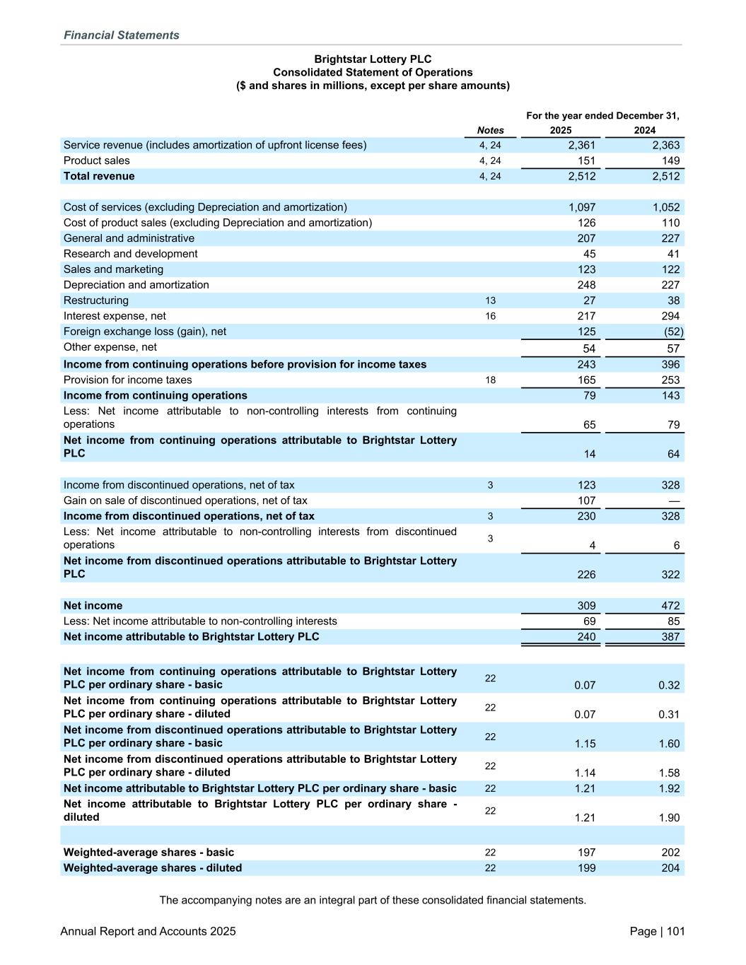 Brightstar Lottery PLC Consolidated Statement of Operations ($ and shares in millions, except per share amounts) For the year ended December 31, Notes 2025 2024 Service revenue (includes amortization of upfront license fees) 4, 24 2,361 2,363 Product sales 4, 24 151 149 Total revenue 4, 24 2,512 2,512 Cost of services (excluding Depreciation and amortization) 1,097 1,052 Cost of product sales (excluding Depreciation and amortization) 126 110 General and administrative 207 227 Research and development 45 41 Sales and marketing 123 122 Depreciation and amortization 248 227 Restructuring 13 27 38 Interest expense, net 16 217 294 Foreign exchange loss (gain), net 125 (52) Other expense, net 54 57 Income from continuing operations before provision for income taxes 243 396 Provision for income taxes 18 165 253 Income from continuing operations 79 143 Less: Net income attributable to non-controlling interests from continuing operations 65 79 Net income from continuing operations attributable to Brightstar Lottery PLC 14 64 Income from discontinued operations, net of tax 3 123 328 Gain on sale of discontinued operations, net of tax 107 — Income from discontinued operations, net of tax 3 230 328 Less: Net income attributable to non-controlling interests from discontinued operations 3 4 6 Net income from discontinued operations attributable to Brightstar Lottery PLC 226 322 Net income 309 472 Less: Net income attributable to non-controlling interests 69 85 Net income attributable to Brightstar Lottery PLC 240 387 Net income from continuing operations attributable to Brightstar Lottery PLC per ordinary share - basic 22 0.07 0.32 Net income from continuing operations attributable to Brightstar Lottery PLC per ordinary share - diluted 22 0.07 0.31 Net income from discontinued operations attributable to Brightstar Lottery PLC per ordinary share - basic 22 1.15 1.60 Net income from discontinued operations attributable to Brightstar Lottery PLC per ordinary share - diluted 22 1.14 1.58 Net income attributable to Brightstar Lottery PLC per ordinary share - basic 22 1.21 1.92 Net income attributable to Brightstar Lottery PLC per ordinary share - diluted 22 1.21 1.90 Weighted-average shares - basic 22 197 202 Weighted-average shares - diluted 22 199 204 The accompanying notes are an integral part of these consolidated financial statements. Financial Statements Annual Report and Accounts 2025 Page | 101