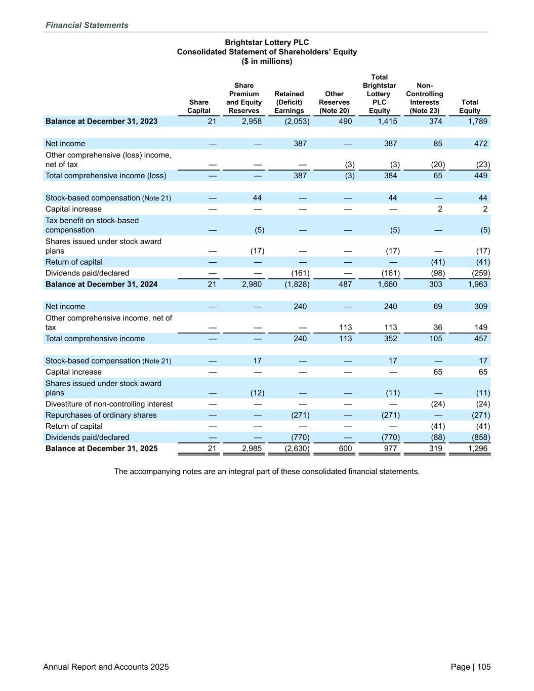 Brightstar Lottery PLC Consolidated Statement of Shareholders’ Equity ($ in millions) Share Capital Share Premium and Equity Reserves Retained (Deficit) Earnings Other Reserves (Note 20) Total Brightstar Lottery PLC Equity Non- Controlling Interests (Note 23) Total Equity Balance at December 31, 2023 21 2,958 (2,053) 490 1,415 374 1,789 Net income — — 387 — 387 85 472 Other comprehensive (loss) income, net of tax — — — (3) (3) (20) (23) Total comprehensive income (loss) — — 387 (3) 384 65 449 Stock-based compensation (Note 21) — 44 — — 44 — 44 Capital increase — — — — — 2 2 Tax benefit on stock-based compensation — (5) — — (5) — (5) Shares issued under stock award plans — (17) — — (17) — (17) Return of capital — — — — — (41) (41) Dividends paid/declared — — (161) — (161) (98) (259) Balance at December 31, 2024 21 2,980 (1,828) 487 1,660 303 1,963 Net income — — 240 — 240 69 309 Other comprehensive income, net of tax — — — 113 113 36 149 Total comprehensive income — — 240 113 352 105 457 Stock-based compensation (Note 21) — 17 — — 17 — 17 Capital increase — — — — — 65 65 Shares issued under stock award plans — (12) — — (11) — (11) Divestiture of non-controlling interest — — — — — (24) (24) Repurchases of ordinary shares — — (271) — (271) — (271) Return of capital — — — — — (41) (41) Dividends paid/declared — — (770) — (770) (88) (858) Balance at December 31, 2025 21 2,985 (2,630) 600 977 319 1,296 The accompanying notes are an integral part of these consolidated financial statements. Financial Statements Annual Report and Accounts 2025 Page | 105
