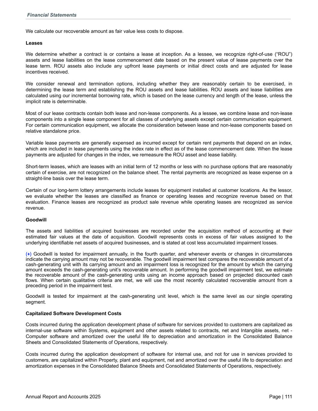 We calculate our recoverable amount as fair value less costs to dispose. Leases We determine whether a contract is or contains a lease at inception. As a lessee, we recognize right-of-use (“ROU”) assets and lease liabilities on the lease commencement date based on the present value of lease payments over the lease term. ROU assets also include any upfront lease payments or initial direct costs and are adjusted for lease incentives received. We consider renewal and termination options, including whether they are reasonably certain to be exercised, in determining the lease term and establishing the ROU assets and lease liabilities. ROU assets and lease liabilities are calculated using our incremental borrowing rate, which is based on the lease currency and length of the lease, unless the implicit rate is determinable. Most of our lease contracts contain both lease and non-lease components. As a lessee, we combine lease and non-lease components into a single lease component for all classes of underlying assets except certain communication equipment. For certain communication equipment, we allocate the consideration between lease and non-lease components based on relative standalone price. Variable lease payments are generally expensed as incurred except for certain rent payments that depend on an index, which are included in lease payments using the index rate in effect as of the lease commencement date. When the lease payments are adjusted for changes in the index, we remeasure the ROU asset and lease liability. Short-term leases, which are leases with an initial term of 12 months or less with no purchase options that are reasonably certain of exercise, are not recognized on the balance sheet. The rental payments are recognized as lease expense on a straight-line basis over the lease term. Certain of our long-term lottery arrangements include leases for equipment installed at customer locations. As the lessor, we evaluate whether the leases are classified as finance or operating leases and recognize revenue based on that evaluation. Finance leases are recognized as product sale revenue while operating leases are recognized as service revenue. Goodwill The assets and liabilities of acquired businesses are recorded under the acquisition method of accounting at their estimated fair values at the date of acquisition. Goodwill represents costs in excess of fair values assigned to the underlying identifiable net assets of acquired businesses, and is stated at cost less accumulated impairment losses. (♦) Goodwill is tested for impairment annually, in the fourth quarter, and whenever events or changes in circumstances indicate the carrying amount may not be recoverable. The goodwill impairment test compares the recoverable amount of a cash-generating unit with its carrying amount and an impairment loss is recognized for the amount by which the carrying amount exceeds the cash-generating unit’s recoverable amount. In performing the goodwill impairment test, we estimate the recoverable amount of the cash-generating units using an income approach based on projected discounted cash flows. When certain qualitative criteria are met, we will use the most recently calculated recoverable amount from a preceding period in the impairment test. Goodwill is tested for impairment at the cash-generating unit level, which is the same level as our single operating segment. Capitalized Software Development Costs Costs incurred during the application development phase of software for services provided to customers are capitalized as internal-use software within Systems, equipment and other assets related to contracts, net and Intangible assets, net - Computer software and amortized over the useful life to depreciation and amortization in the Consolidated Balance Sheets and Consolidated Statements of Operations, respectively. Costs incurred during the application development of software for internal use, and not for use in services provided to customers, are capitalized within Property, plant and equipment, net and amortized over the useful life to depreciation and amortization expenses in the Consolidated Balance Sheets and Consolidated Statements of Operations, respectively. Financial Statements Annual Report and Accounts 2025 Page | 111