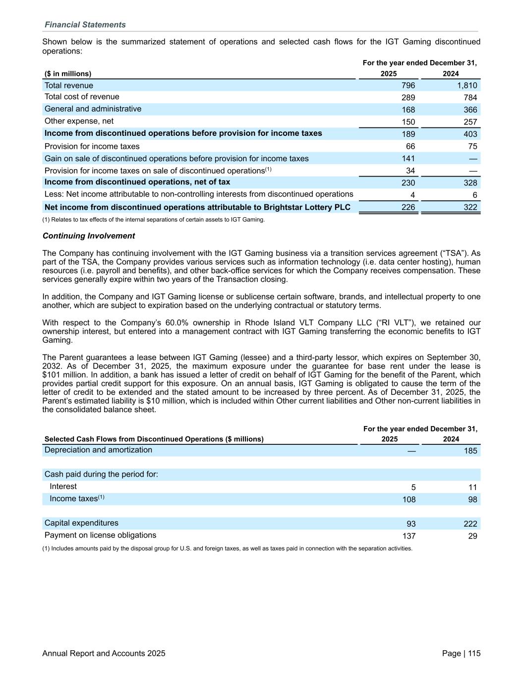 Shown below is the summarized statement of operations and selected cash flows for the IGT Gaming discontinued operations: For the year ended December 31, ($ in millions) 2025 2024 Total revenue 796 1,810 Total cost of revenue 289 784 General and administrative 168 366 Other expense, net 150 257 Income from discontinued operations before provision for income taxes 189 403 Provision for income taxes 66 75 Gain on sale of discontinued operations before provision for income taxes 141 — Provision for income taxes on sale of discontinued operations(1) 34 — Income from discontinued operations, net of tax 230 328 Less: Net income attributable to non-controlling interests from discontinued operations 4 6 Net income from discontinued operations attributable to Brightstar Lottery PLC 226 322 (1) Relates to tax effects of the internal separations of certain assets to IGT Gaming. Continuing Involvement The Company has continuing involvement with the IGT Gaming business via a transition services agreement (“TSA”). As part of the TSA, the Company provides various services such as information technology (i.e. data center hosting), human resources (i.e. payroll and benefits), and other back-office services for which the Company receives compensation. These services generally expire within two years of the Transaction closing. In addition, the Company and IGT Gaming license or sublicense certain software, brands, and intellectual property to one another, which are subject to expiration based on the underlying contractual or statutory terms. With respect to the Company’s 60.0% ownership in Rhode Island VLT Company LLC (“RI VLT”), we retained our ownership interest, but entered into a management contract with IGT Gaming transferring the economic benefits to IGT Gaming. The Parent guarantees a lease between IGT Gaming (lessee) and a third-party lessor, which expires on September 30, 2032. As of December 31, 2025, the maximum exposure under the guarantee for base rent under the lease is $101 million. In addition, a bank has issued a letter of credit on behalf of IGT Gaming for the benefit of the Parent, which provides partial credit support for this exposure. On an annual basis, IGT Gaming is obligated to cause the term of the letter of credit to be extended and the stated amount to be increased by three percent. As of December 31, 2025, the Parent’s estimated liability is $10 million, which is included within Other current liabilities and Other non-current liabilities in the consolidated balance sheet. For the year ended December 31, Selected Cash Flows from Discontinued Operations ($ millions) 2025 2024 Depreciation and amortization — 185 Cash paid during the period for: Interest 5 11 Income taxes(1) 108 98 Capital expenditures 93 222 Payment on license obligations 137 29 (1) Includes amounts paid by the disposal group for U.S. and foreign taxes, as well as taxes paid in connection with the separation activities. Financial Statements Annual Report and Accounts 2025 Page | 115