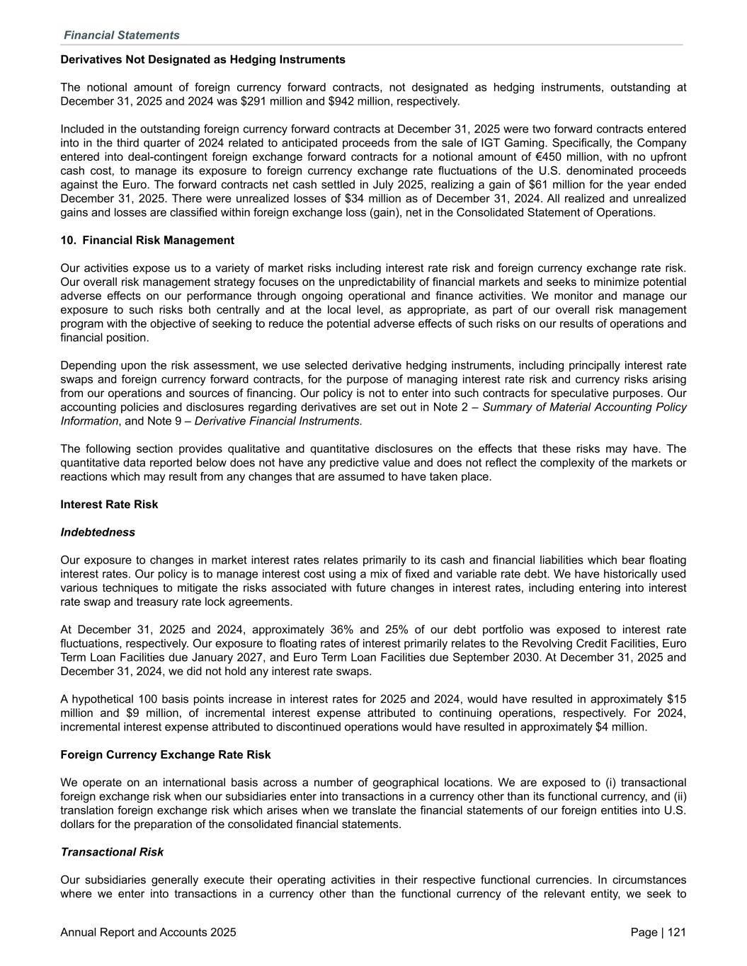 Derivatives Not Designated as Hedging Instruments The notional amount of foreign currency forward contracts, not designated as hedging instruments, outstanding at December 31, 2025 and 2024 was $291 million and $942 million, respectively. Included in the outstanding foreign currency forward contracts at December 31, 2025 were two forward contracts entered into in the third quarter of 2024 related to anticipated proceeds from the sale of IGT Gaming. Specifically, the Company entered into deal-contingent foreign exchange forward contracts for a notional amount of €450 million, with no upfront cash cost, to manage its exposure to foreign currency exchange rate fluctuations of the U.S. denominated proceeds against the Euro. The forward contracts net cash settled in July 2025, realizing a gain of $61 million for the year ended December 31, 2025. There were unrealized losses of $34 million as of December 31, 2024. All realized and unrealized gains and losses are classified within foreign exchange loss (gain), net in the Consolidated Statement of Operations. 10. Financial Risk Management Our activities expose us to a variety of market risks including interest rate risk and foreign currency exchange rate risk. Our overall risk management strategy focuses on the unpredictability of financial markets and seeks to minimize potential adverse effects on our performance through ongoing operational and finance activities. We monitor and manage our exposure to such risks both centrally and at the local level, as appropriate, as part of our overall risk management program with the objective of seeking to reduce the potential adverse effects of such risks on our results of operations and financial position. Depending upon the risk assessment, we use selected derivative hedging instruments, including principally interest rate swaps and foreign currency forward contracts, for the purpose of managing interest rate risk and currency risks arising from our operations and sources of financing. Our policy is not to enter into such contracts for speculative purposes. Our accounting policies and disclosures regarding derivatives are set out in Note 2 – Summary of Material Accounting Policy Information, and Note 9 – Derivative Financial Instruments. The following section provides qualitative and quantitative disclosures on the effects that these risks may have. The quantitative data reported below does not have any predictive value and does not reflect the complexity of the markets or reactions which may result from any changes that are assumed to have taken place. Interest Rate Risk Indebtedness Our exposure to changes in market interest rates relates primarily to its cash and financial liabilities which bear floating interest rates. Our policy is to manage interest cost using a mix of fixed and variable rate debt. We have historically used various techniques to mitigate the risks associated with future changes in interest rates, including entering into interest rate swap and treasury rate lock agreements. At December 31, 2025 and 2024, approximately 36% and 25% of our debt portfolio was exposed to interest rate fluctuations, respectively. Our exposure to floating rates of interest primarily relates to the Revolving Credit Facilities, Euro Term Loan Facilities due January 2027, and Euro Term Loan Facilities due September 2030. At December 31, 2025 and December 31, 2024, we did not hold any interest rate swaps. A hypothetical 100 basis points increase in interest rates for 2025 and 2024, would have resulted in approximately $15 million and $9 million, of incremental interest expense attributed to continuing operations, respectively. For 2024, incremental interest expense attributed to discontinued operations would have resulted in approximately $4 million. Foreign Currency Exchange Rate Risk We operate on an international basis across a number of geographical locations. We are exposed to (i) transactional foreign exchange risk when our subsidiaries enter into transactions in a currency other than its functional currency, and (ii) translation foreign exchange risk which arises when we translate the financial statements of our foreign entities into U.S. dollars for the preparation of the consolidated financial statements. Transactional Risk Our subsidiaries generally execute their operating activities in their respective functional currencies. In circumstances where we enter into transactions in a currency other than the functional currency of the relevant entity, we seek to Financial Statements Annual Report and Accounts 2025 Page | 121