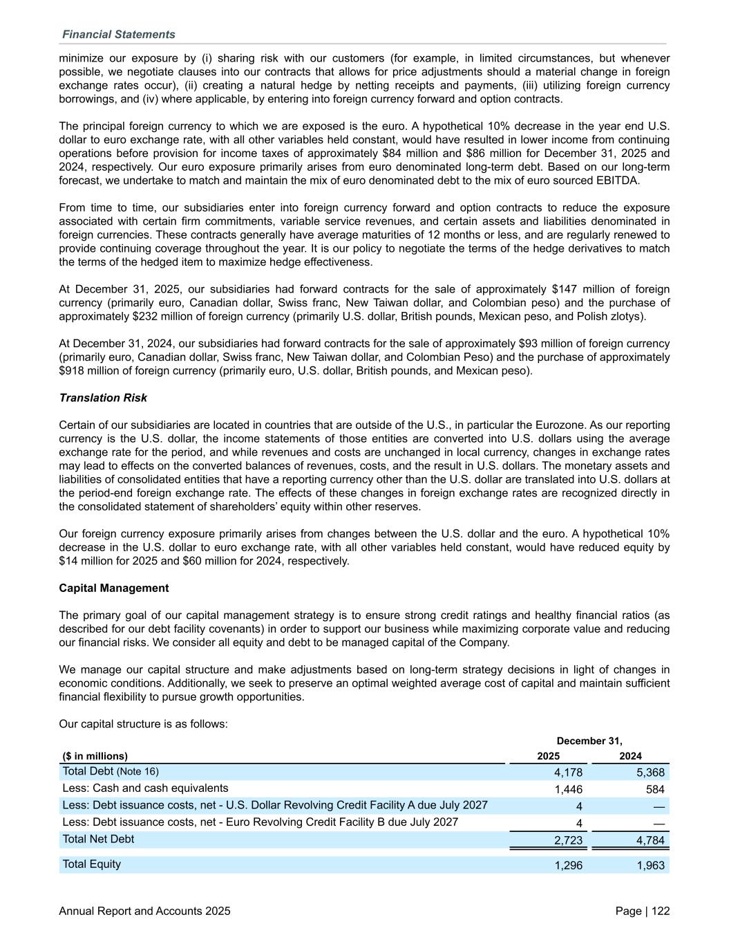 minimize our exposure by (i) sharing risk with our customers (for example, in limited circumstances, but whenever possible, we negotiate clauses into our contracts that allows for price adjustments should a material change in foreign exchange rates occur), (ii) creating a natural hedge by netting receipts and payments, (iii) utilizing foreign currency borrowings, and (iv) where applicable, by entering into foreign currency forward and option contracts. The principal foreign currency to which we are exposed is the euro. A hypothetical 10% decrease in the year end U.S. dollar to euro exchange rate, with all other variables held constant, would have resulted in lower income from continuing operations before provision for income taxes of approximately $84 million and $86 million for December 31, 2025 and 2024, respectively. Our euro exposure primarily arises from euro denominated long-term debt. Based on our long-term forecast, we undertake to match and maintain the mix of euro denominated debt to the mix of euro sourced EBITDA. From time to time, our subsidiaries enter into foreign currency forward and option contracts to reduce the exposure associated with certain firm commitments, variable service revenues, and certain assets and liabilities denominated in foreign currencies. These contracts generally have average maturities of 12 months or less, and are regularly renewed to provide continuing coverage throughout the year. It is our policy to negotiate the terms of the hedge derivatives to match the terms of the hedged item to maximize hedge effectiveness. At December 31, 2025, our subsidiaries had forward contracts for the sale of approximately $147 million of foreign currency (primarily euro, Canadian dollar, Swiss franc, New Taiwan dollar, and Colombian peso) and the purchase of approximately $232 million of foreign currency (primarily U.S. dollar, British pounds, Mexican peso, and Polish zlotys). At December 31, 2024, our subsidiaries had forward contracts for the sale of approximately $93 million of foreign currency (primarily euro, Canadian dollar, Swiss franc, New Taiwan dollar, and Colombian Peso) and the purchase of approximately $918 million of foreign currency (primarily euro, U.S. dollar, British pounds, and Mexican peso). Translation Risk Certain of our subsidiaries are located in countries that are outside of the U.S., in particular the Eurozone. As our reporting currency is the U.S. dollar, the income statements of those entities are converted into U.S. dollars using the average exchange rate for the period, and while revenues and costs are unchanged in local currency, changes in exchange rates may lead to effects on the converted balances of revenues, costs, and the result in U.S. dollars. The monetary assets and liabilities of consolidated entities that have a reporting currency other than the U.S. dollar are translated into U.S. dollars at the period-end foreign exchange rate. The effects of these changes in foreign exchange rates are recognized directly in the consolidated statement of shareholders’ equity within other reserves. Our foreign currency exposure primarily arises from changes between the U.S. dollar and the euro. A hypothetical 10% decrease in the U.S. dollar to euro exchange rate, with all other variables held constant, would have reduced equity by $14 million for 2025 and $60 million for 2024, respectively. Capital Management The primary goal of our capital management strategy is to ensure strong credit ratings and healthy financial ratios (as described for our debt facility covenants) in order to support our business while maximizing corporate value and reducing our financial risks. We consider all equity and debt to be managed capital of the Company. We manage our capital structure and make adjustments based on long-term strategy decisions in light of changes in economic conditions. Additionally, we seek to preserve an optimal weighted average cost of capital and maintain sufficient financial flexibility to pursue growth opportunities. Our capital structure is as follows: December 31, ($ in millions) 2025 2024 Total Debt (Note 16) 4,178 5,368 Less: Cash and cash equivalents 1,446 584 Less: Debt issuance costs, net - U.S. Dollar Revolving Credit Facility A due July 2027 4 — Less: Debt issuance costs, net - Euro Revolving Credit Facility B due July 2027 4 — Total Net Debt 2,723 4,784 Total Equity 1,296 1,963 Financial Statements Annual Report and Accounts 2025 Page | 122