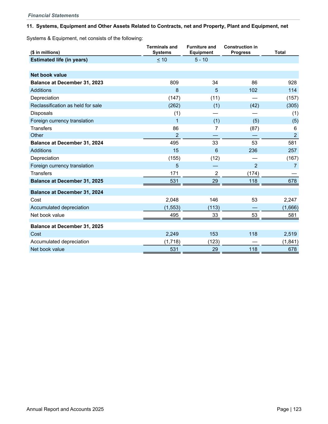 11. Systems, Equipment and Other Assets Related to Contracts, net and Property, Plant and Equipment, net Systems & Equipment, net consists of the following: ($ in millions) Terminals and Systems Furniture and Equipment Construction in Progress Total Estimated life (in years) < 10 5 - 10 Net book value Balance at December 31, 2023 809 34 86 928 Additions 8 5 102 114 Depreciation (147) (11) — (157) Reclassification as held for sale (262) (1) (42) (305) Disposals (1) — — (1) Foreign currency translation 1 (1) (5) (5) Transfers 86 7 (87) 6 Other 2 — — 2 Balance at December 31, 2024 495 33 53 581 Additions 15 6 236 257 Depreciation (155) (12) — (167) Foreign currency translation 5 — 2 7 Transfers 171 2 (174) — Balance at December 31, 2025 531 29 118 678 Balance at December 31, 2024 Cost 2,048 146 53 2,247 Accumulated depreciation (1,553) (113) — (1,666) Net book value 495 33 53 581 Balance at December 31, 2025 Cost 2,249 153 118 2,519 Accumulated depreciation (1,718) (123) — (1,841) Net book value 531 29 118 678 Financial Statements Annual Report and Accounts 2025 Page | 123