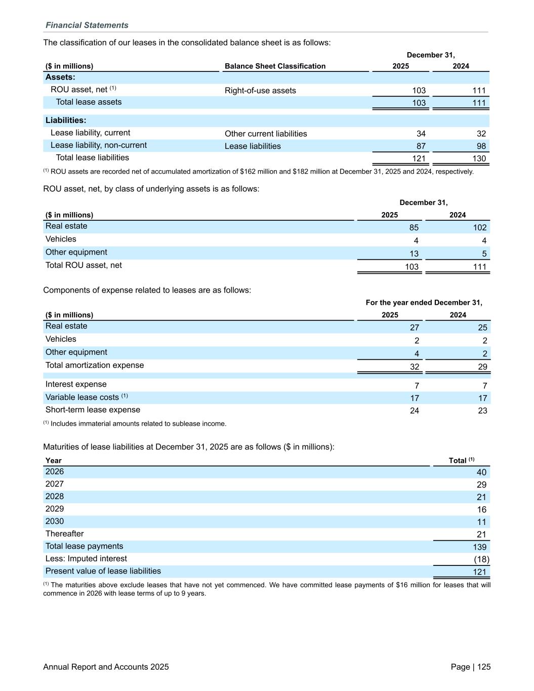 The classification of our leases in the consolidated balance sheet is as follows: December 31, ($ in millions) Balance Sheet Classification 2025 2024 Assets: ROU asset, net (1) Right-of-use assets 103 111 Total lease assets 103 111 Liabilities: Lease liability, current Other current liabilities 34 32 Lease liability, non-current Lease liabilities 87 98 Total lease liabilities 121 130 (1) ROU assets are recorded net of accumulated amortization of $162 million and $182 million at December 31, 2025 and 2024, respectively. ROU asset, net, by class of underlying assets is as follows: December 31, ($ in millions) 2025 2024 Real estate 85 102 Vehicles 4 4 Other equipment 13 5 Total ROU asset, net 103 111 Components of expense related to leases are as follows: For the year ended December 31, ($ in millions) 2025 2024 Real estate 27 25 Vehicles 2 2 Other equipment 4 2 Total amortization expense 32 29 Interest expense 7 7 Variable lease costs (1) 17 17 Short-term lease expense 24 23 (1) Includes immaterial amounts related to sublease income. Maturities of lease liabilities at December 31, 2025 are as follows ($ in millions): Year Total (1) 2026 40 2027 29 2028 21 2029 16 2030 11 Thereafter 21 Total lease payments 139 Less: Imputed interest (18) Present value of lease liabilities 121 (1) The maturities above exclude leases that have not yet commenced. We have committed lease payments of $16 million for leases that will commence in 2026 with lease terms of up to 9 years. Financial Statements Annual Report and Accounts 2025 Page | 125