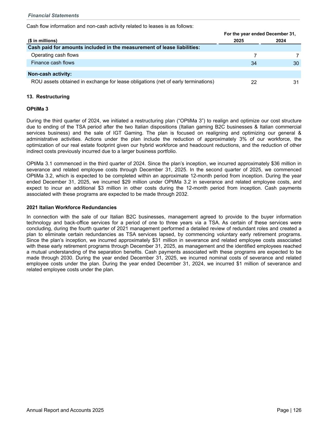 Cash flow information and non-cash activity related to leases is as follows: For the year ended December 31, ($ in millions) 2025 2024 Cash paid for amounts included in the measurement of lease liabilities: Operating cash flows 7 7 Finance cash flows 34 30 Non-cash activity: ROU assets obtained in exchange for lease obligations (net of early terminations) 22 31 13. Restructuring OPtiMa 3 During the third quarter of 2024, we initiated a restructuring plan (“OPtiMa 3”) to realign and optimize our cost structure due to ending of the TSA period after the two Italian dispositions (Italian gaming B2C businesses & Italian commercial services business) and the sale of IGT Gaming. The plan is focused on realigning and optimizing our general & administrative activities. Actions under the plan include the reduction of approximately 3% of our workforce, the optimization of our real estate footprint given our hybrid workforce and headcount reductions, and the reduction of other indirect costs previously incurred due to a larger business portfolio. OPtiMa 3.1 commenced in the third quarter of 2024. Since the plan’s inception, we incurred approximately $36 million in severance and related employee costs through December 31, 2025. In the second quarter of 2025, we commenced OPtiMa 3.2, which is expected to be completed within an approximate 12-month period from inception. During the year ended December 31, 2025, we incurred $29 million under OPtiMa 3.2 in severance and related employee costs, and expect to incur an additional $3 million in other costs during the 12-month period from inception. Cash payments associated with these programs are expected to be made through 2032. 2021 Italian Workforce Redundancies In connection with the sale of our Italian B2C businesses, management agreed to provide to the buyer information technology and back-office services for a period of one to three years via a TSA. As certain of these services were concluding, during the fourth quarter of 2021 management performed a detailed review of redundant roles and created a plan to eliminate certain redundancies as TSA services lapsed, by commencing voluntary early retirement programs. Since the plan’s inception, we incurred approximately $31 million in severance and related employee costs associated with these early retirement programs through December 31, 2025, as management and the identified employees reached a mutual understanding of the separation benefits. Cash payments associated with these programs are expected to be made through 2030. During the year ended December 31, 2025, we incurred nominal costs of severance and related employee costs under the plan. During the year ended December 31, 2024, we incurred $1 million of severance and related employee costs under the plan. Financial Statements Annual Report and Accounts 2025 Page | 126