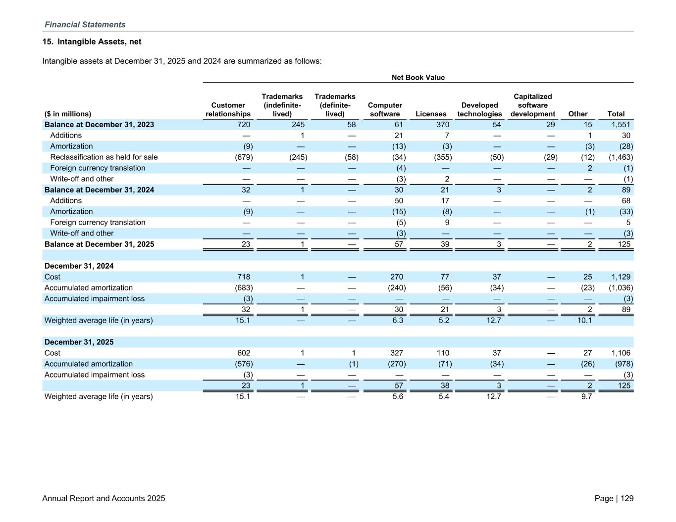 15. Intangible Assets, net Intangible assets at December 31, 2025 and 2024 are summarized as follows: Net Book Value ($ in millions) Customer relationships Trademarks (indefinite- lived) Trademarks (definite- lived) Computer software Licenses Developed technologies Capitalized software development Other Total Balance at December 31, 2023 720 245 58 61 370 54 29 15 1,551 Additions — 1 — 21 7 — — 1 30 Amortization (9) — — (13) (3) — — (3) (28) Reclassification as held for sale (679) (245) (58) (34) (355) (50) (29) (12) (1,463) Foreign currency translation — — — (4) — — — 2 (1) Write-off and other — — — (3) 2 — — — (1) Balance at December 31, 2024 32 1 — 30 21 3 — 2 89 Additions — — — 50 17 — — — 68 Amortization (9) — — (15) (8) — — (1) (33) Foreign currency translation — — — (5) 9 — — — 5 Write-off and other — — — (3) — — — — (3) Balance at December 31, 2025 23 1 — 57 39 3 — 2 125 December 31, 2024 Cost 718 1 — 270 77 37 — 25 1,129 Accumulated amortization (683) — — (240) (56) (34) — (23) (1,036) Accumulated impairment loss (3) — — — — — — — (3) 32 1 — 30 21 3 — 2 89 Weighted average life (in years) 15.1 — — 6.3 5.2 12.7 — 10.1 December 31, 2025 Cost 602 1 1 327 110 37 — 27 1,106 Accumulated amortization (576) — (1) (270) (71) (34) — (26) (978) Accumulated impairment loss (3) — — — — — — — (3) 23 1 — 57 38 3 — 2 125 Weighted average life (in years) 15.1 — — 5.6 5.4 12.7 — 9.7 Financial Statements Annual Report and Accounts 2025 Page | 129