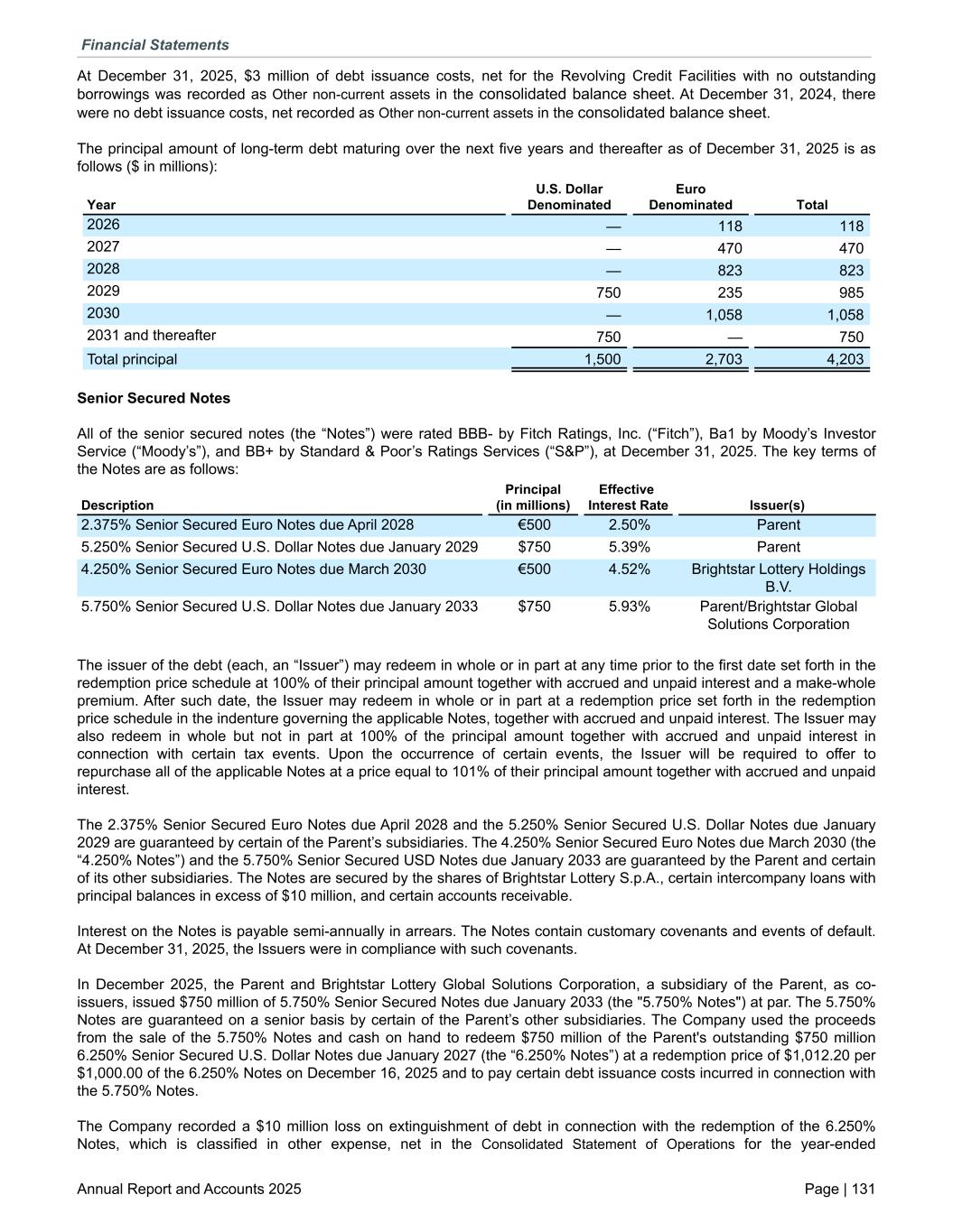 At December 31, 2025, $3 million of debt issuance costs, net for the Revolving Credit Facilities with no outstanding borrowings was recorded as Other non-current assets in the consolidated balance sheet. At December 31, 2024, there were no debt issuance costs, net recorded as Other non-current assets in the consolidated balance sheet. The principal amount of long-term debt maturing over the next five years and thereafter as of December 31, 2025 is as follows ($ in millions): Year U.S. Dollar Denominated Euro Denominated Total 2026 — 118 118 2027 — 470 470 2028 — 823 823 2029 750 235 985 2030 — 1,058 1,058 2031 and thereafter 750 — 750 Total principal 1,500 2,703 4,203 Senior Secured Notes All of the senior secured notes (the “Notes”) were rated BBB- by Fitch Ratings, Inc. (“Fitch”), Ba1 by Moody’s Investor Service (“Moody’s”), and BB+ by Standard & Poor’s Ratings Services (“S&P”), at December 31, 2025. The key terms of the Notes are as follows: Description Principal (in millions) Effective Interest Rate Issuer(s) 2.375% Senior Secured Euro Notes due April 2028 €500 2.50% Parent 5.250% Senior Secured U.S. Dollar Notes due January 2029 $750 5.39% Parent 4.250% Senior Secured Euro Notes due March 2030 €500 4.52% Brightstar Lottery Holdings B.V. 5.750% Senior Secured U.S. Dollar Notes due January 2033 $750 5.93% Parent/Brightstar Global Solutions Corporation The issuer of the debt (each, an “Issuer”) may redeem in whole or in part at any time prior to the first date set forth in the redemption price schedule at 100% of their principal amount together with accrued and unpaid interest and a make-whole premium. After such date, the Issuer may redeem in whole or in part at a redemption price set forth in the redemption price schedule in the indenture governing the applicable Notes, together with accrued and unpaid interest. The Issuer may also redeem in whole but not in part at 100% of the principal amount together with accrued and unpaid interest in connection with certain tax events. Upon the occurrence of certain events, the Issuer will be required to offer to repurchase all of the applicable Notes at a price equal to 101% of their principal amount together with accrued and unpaid interest. The 2.375% Senior Secured Euro Notes due April 2028 and the 5.250% Senior Secured U.S. Dollar Notes due January 2029 are guaranteed by certain of the Parent’s subsidiaries. The 4.250% Senior Secured Euro Notes due March 2030 (the “4.250% Notes”) and the 5.750% Senior Secured USD Notes due January 2033 are guaranteed by the Parent and certain of its other subsidiaries. The Notes are secured by the shares of Brightstar Lottery S.p.A., certain intercompany loans with principal balances in excess of $10 million, and certain accounts receivable. Interest on the Notes is payable semi-annually in arrears. The Notes contain customary covenants and events of default. At December 31, 2025, the Issuers were in compliance with such covenants. In December 2025, the Parent and Brightstar Lottery Global Solutions Corporation, a subsidiary of the Parent, as co- issuers, issued $750 million of 5.750% Senior Secured Notes due January 2033 (the "5.750% Notes") at par. The 5.750% Notes are guaranteed on a senior basis by certain of the Parent’s other subsidiaries. The Company used the proceeds from the sale of the 5.750% Notes and cash on hand to redeem $750 million of the Parent's outstanding $750 million 6.250% Senior Secured U.S. Dollar Notes due January 2027 (the “6.250% Notes”) at a redemption price of $1,012.20 per $1,000.00 of the 6.250% Notes on December 16, 2025 and to pay certain debt issuance costs incurred in connection with the 5.750% Notes. The Company recorded a $10 million loss on extinguishment of debt in connection with the redemption of the 6.250% Notes, which is classified in other expense, net in the Consolidated Statement of Operations for the year-ended Financial Statements Annual Report and Accounts 2025 Page | 131