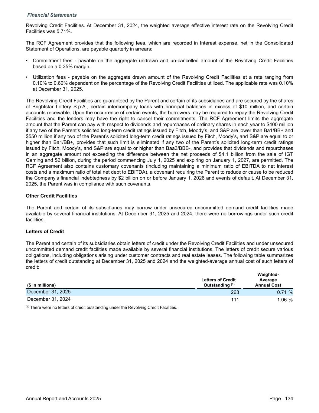 Revolving Credit Facilities. At December 31, 2024, the weighted average effective interest rate on the Revolving Credit Facilities was 5.71%. The RCF Agreement provides that the following fees, which are recorded in Interest expense, net in the Consolidated Statement of Operations, are payable quarterly in arrears: • Commitment fees - payable on the aggregate undrawn and un-cancelled amount of the Revolving Credit Facilities based on a 0.35% margin. • Utilization fees - payable on the aggregate drawn amount of the Revolving Credit Facilities at a rate ranging from 0.10% to 0.60% dependent on the percentage of the Revolving Credit Facilities utilized. The applicable rate was 0.10% at December 31, 2025. The Revolving Credit Facilities are guaranteed by the Parent and certain of its subsidiaries and are secured by the shares of Brightstar Lottery S.p.A., certain intercompany loans with principal balances in excess of $10 million, and certain accounts receivable. Upon the occurrence of certain events, the borrowers may be required to repay the Revolving Credit Facilities and the lenders may have the right to cancel their commitments. The RCF Agreement limits the aggregate amount that the Parent can pay with respect to dividends and repurchases of ordinary shares in each year to $400 million if any two of the Parent’s solicited long-term credit ratings issued by Fitch, Moody’s, and S&P are lower than Ba1/BB+ and $550 million if any two of the Parent’s solicited long-term credit ratings issued by Fitch, Moody’s, and S&P are equal to or higher than Ba1/BB+, provides that such limit is eliminated if any two of the Parent’s solicited long-term credit ratings issued by Fitch, Moody’s, and S&P are equal to or higher than Baa3/BBB-, and provides that dividends and repurchases in an aggregate amount not exceeding the difference between the net proceeds of $4.1 billion from the sale of IGT Gaming and $2 billion, during the period commencing July 1, 2025 and expiring on January 1, 2027, are permitted. The RCF Agreement also contains customary covenants (including maintaining a minimum ratio of EBITDA to net interest costs and a maximum ratio of total net debt to EBITDA), a covenant requiring the Parent to reduce or cause to be reduced the Company’s financial indebtedness by $2 billion on or before January 1, 2026 and events of default. At December 31, 2025, the Parent was in compliance with such covenants. Other Credit Facilities The Parent and certain of its subsidiaries may borrow under unsecured uncommitted demand credit facilities made available by several financial institutions. At December 31, 2025 and 2024, there were no borrowings under such credit facilities. Letters of Credit The Parent and certain of its subsidiaries obtain letters of credit under the Revolving Credit Facilities and under unsecured uncommitted demand credit facilities made available by several financial institutions. The letters of credit secure various obligations, including obligations arising under customer contracts and real estate leases. The following table summarizes the letters of credit outstanding at December 31, 2025 and 2024 and the weighted-average annual cost of such letters of credit: ($ in millions) Letters of Credit Outstanding (1) Weighted- Average Annual Cost December 31, 2025 263 0.71 % December 31, 2024 111 1.06 % (1) There were no letters of credit outstanding under the Revolving Credit Facilities. Financial Statements Annual Report and Accounts 2025 Page | 134
