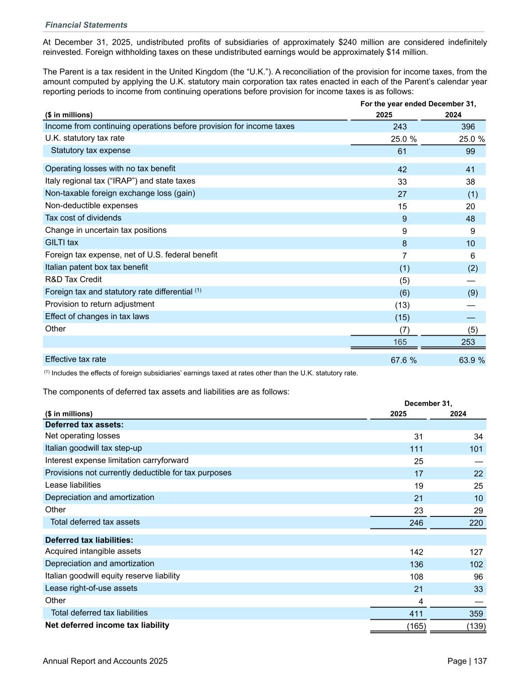 At December 31, 2025, undistributed profits of subsidiaries of approximately $240 million are considered indefinitely reinvested. Foreign withholding taxes on these undistributed earnings would be approximately $14 million. The Parent is a tax resident in the United Kingdom (the “U.K.”). A reconciliation of the provision for income taxes, from the amount computed by applying the U.K. statutory main corporation tax rates enacted in each of the Parent’s calendar year reporting periods to income from continuing operations before provision for income taxes is as follows: For the year ended December 31, ($ in millions) 2025 2024 Income from continuing operations before provision for income taxes 243 396 U.K. statutory tax rate 25.0 % 25.0 % Statutory tax expense 61 99 Operating losses with no tax benefit 42 41 Italy regional tax (“IRAP”) and state taxes 33 38 Non-taxable foreign exchange loss (gain) 27 (1) Non-deductible expenses 15 20 Tax cost of dividends 9 48 Change in uncertain tax positions 9 9 GILTI tax 8 10 Foreign tax expense, net of U.S. federal benefit 7 6 Italian patent box tax benefit (1) (2) R&D Tax Credit (5) — Foreign tax and statutory rate differential (1) (6) (9) Provision to return adjustment (13) — Effect of changes in tax laws (15) — Other (7) (5) 165 253 Effective tax rate 67.6 % 63.9 % (1) Includes the effects of foreign subsidiaries’ earnings taxed at rates other than the U.K. statutory rate. The components of deferred tax assets and liabilities are as follows: December 31, ($ in millions) 2025 2024 Deferred tax assets: Net operating losses 31 34 Italian goodwill tax step-up 111 101 Interest expense limitation carryforward 25 — Provisions not currently deductible for tax purposes 17 22 Lease liabilities 19 25 Depreciation and amortization 21 10 Other 23 29 Total deferred tax assets 246 220 Deferred tax liabilities: Acquired intangible assets 142 127 Depreciation and amortization 136 102 Italian goodwill equity reserve liability 108 96 Lease right-of-use assets 21 33 Other 4 — Total deferred tax liabilities 411 359 Net deferred income tax liability (165) (139) Financial Statements Annual Report and Accounts 2025 Page | 137