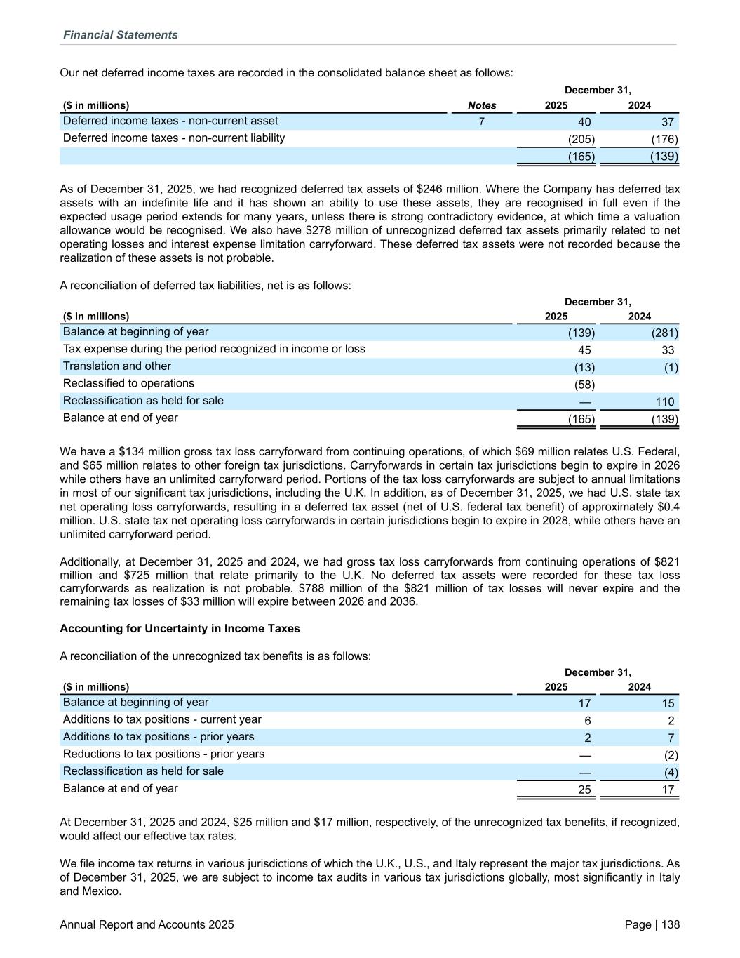 Our net deferred income taxes are recorded in the consolidated balance sheet as follows: December 31, ($ in millions) Notes 2025 2024 Deferred income taxes - non-current asset 7 40 37 Deferred income taxes - non-current liability (205) (176) (165) (139) As of December 31, 2025, we had recognized deferred tax assets of $246 million. Where the Company has deferred tax assets with an indefinite life and it has shown an ability to use these assets, they are recognised in full even if the expected usage period extends for many years, unless there is strong contradictory evidence, at which time a valuation allowance would be recognised. We also have $278 million of unrecognized deferred tax assets primarily related to net operating losses and interest expense limitation carryforward. These deferred tax assets were not recorded because the realization of these assets is not probable. A reconciliation of deferred tax liabilities, net is as follows: December 31, ($ in millions) 2025 2024 Balance at beginning of year (139) (281) Tax expense during the period recognized in income or loss 45 33 Translation and other (13) (1) Reclassified to operations (58) Reclassification as held for sale — 110 Balance at end of year (165) (139) We have a $134 million gross tax loss carryforward from continuing operations, of which $69 million relates U.S. Federal, and $65 million relates to other foreign tax jurisdictions. Carryforwards in certain tax jurisdictions begin to expire in 2026 while others have an unlimited carryforward period. Portions of the tax loss carryforwards are subject to annual limitations in most of our significant tax jurisdictions, including the U.K. In addition, as of December 31, 2025, we had U.S. state tax net operating loss carryforwards, resulting in a deferred tax asset (net of U.S. federal tax benefit) of approximately $0.4 million. U.S. state tax net operating loss carryforwards in certain jurisdictions begin to expire in 2028, while others have an unlimited carryforward period. Additionally, at December 31, 2025 and 2024, we had gross tax loss carryforwards from continuing operations of $821 million and $725 million that relate primarily to the U.K. No deferred tax assets were recorded for these tax loss carryforwards as realization is not probable. $788 million of the $821 million of tax losses will never expire and the remaining tax losses of $33 million will expire between 2026 and 2036. Accounting for Uncertainty in Income Taxes A reconciliation of the unrecognized tax benefits is as follows: December 31, ($ in millions) 2025 2024 Balance at beginning of year 17 15 Additions to tax positions - current year 6 2 Additions to tax positions - prior years 2 7 Reductions to tax positions - prior years — (2) Reclassification as held for sale — (4) Balance at end of year 25 17 At December 31, 2025 and 2024, $25 million and $17 million, respectively, of the unrecognized tax benefits, if recognized, would affect our effective tax rates. We file income tax returns in various jurisdictions of which the U.K., U.S., and Italy represent the major tax jurisdictions. As of December 31, 2025, we are subject to income tax audits in various tax jurisdictions globally, most significantly in Italy and Mexico. Financial Statements Annual Report and Accounts 2025 Page | 138