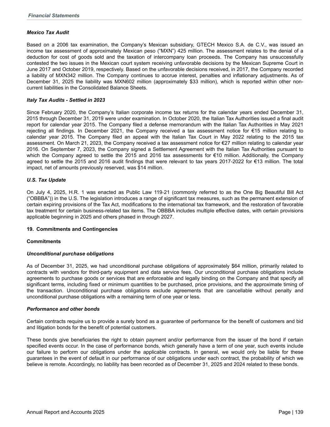 Mexico Tax Audit Based on a 2006 tax examination, the Company’s Mexican subsidiary, GTECH Mexico S.A. de C.V., was issued an income tax assessment of approximately Mexican peso (“MXN”) 425 million. The assessment relates to the denial of a deduction for cost of goods sold and the taxation of intercompany loan proceeds. The Company has unsuccessfully contested the two issues in the Mexican court system receiving unfavorable decisions by the Mexican Supreme Court in June 2017 and October 2019, respectively. Based on the unfavorable decisions received, in 2017, the Company recorded a liability of MXN342 million. The Company continues to accrue interest, penalties and inflationary adjustments. As of December 31, 2025 the liability was MXN602 million (approximately $33 million), which is reported within other non- current liabilities in the Consolidated Balance Sheets. Italy Tax Audits - Settled in 2023 Since February 2020, the Company’s Italian corporate income tax returns for the calendar years ended December 31, 2015 through December 31, 2019 were under examination. In October 2020, the Italian Tax Authorities issued a final audit report for calendar year 2015. The Company filed a defense memorandum with the Italian Tax Authorities in May 2021 rejecting all findings. In December 2021, the Company received a tax assessment notice for €15 million relating to calendar year 2015. The Company filed an appeal with the Italian Tax Court in May 2022 relating to the 2015 tax assessment. On March 21, 2023, the Company received a tax assessment notice for €27 million relating to calendar year 2016. On September 7, 2023, the Company signed a Settlement Agreement with the Italian Tax Authorities pursuant to which the Company agreed to settle the 2015 and 2016 tax assessments for €10 million. Additionally, the Company agreed to settle the 2015 and 2016 audit findings that were relevant to tax years 2017-2022 for €13 million. The total impact, net of amounts previously reserved, was $14 million. U.S. Tax Update On July 4, 2025, H.R. 1 was enacted as Public Law 119-21 (commonly referred to as the One Big Beautiful Bill Act (“OBBBA”)) in the U.S. The legislation introduces a range of significant tax measures, such as the permanent extension of certain expiring provisions of the Tax Act, modifications to the international tax framework, and the restoration of favorable tax treatment for certain business-related tax items. The OBBBA includes multiple effective dates, with certain provisions applicable beginning in 2025 and others phased in through 2027. 19. Commitments and Contingencies Commitments Unconditional purchase obligations As of December 31, 2025, we had unconditional purchase obligations of approximately $64 million, primarily related to contracts with vendors for third-party equipment and data service fees. Our unconditional purchase obligations include agreements to purchase goods or services that are enforceable and legally binding on the Company and that specify all significant terms, including fixed or minimum quantities to be purchased, price provisions, and the approximate timing of the transaction. Unconditional purchase obligations exclude agreements that are cancellable without penalty and unconditional purchase obligations with a remaining term of one year or less. Performance and other bonds Certain contracts require us to provide a surety bond as a guarantee of performance for the benefit of customers and bid and litigation bonds for the benefit of potential customers. These bonds give beneficiaries the right to obtain payment and/or performance from the issuer of the bond if certain specified events occur. In the case of performance bonds, which generally have a term of one year, such events include our failure to perform our obligations under the applicable contracts. In general, we would only be liable for these guarantees in the event of default in our performance of our obligations under each contract, the probability of which we believe is remote. Accordingly, no liability has been recorded as of December 31, 2025 and 2024 related to these bonds. Financial Statements Annual Report and Accounts 2025 Page | 139