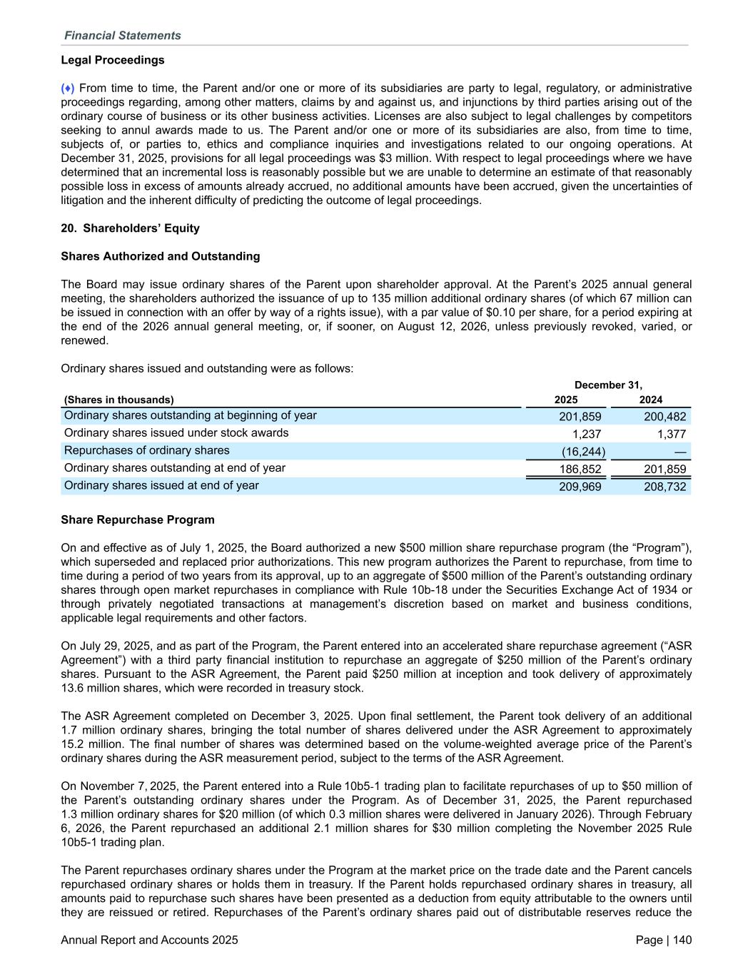 Legal Proceedings (♦) From time to time, the Parent and/or one or more of its subsidiaries are party to legal, regulatory, or administrative proceedings regarding, among other matters, claims by and against us, and injunctions by third parties arising out of the ordinary course of business or its other business activities. Licenses are also subject to legal challenges by competitors seeking to annul awards made to us. The Parent and/or one or more of its subsidiaries are also, from time to time, subjects of, or parties to, ethics and compliance inquiries and investigations related to our ongoing operations. At December 31, 2025, provisions for all legal proceedings was $3 million. With respect to legal proceedings where we have determined that an incremental loss is reasonably possible but we are unable to determine an estimate of that reasonably possible loss in excess of amounts already accrued, no additional amounts have been accrued, given the uncertainties of litigation and the inherent difficulty of predicting the outcome of legal proceedings. 20. Shareholders’ Equity Shares Authorized and Outstanding The Board may issue ordinary shares of the Parent upon shareholder approval. At the Parent’s 2025 annual general meeting, the shareholders authorized the issuance of up to 135 million additional ordinary shares (of which 67 million can be issued in connection with an offer by way of a rights issue), with a par value of $0.10 per share, for a period expiring at the end of the 2026 annual general meeting, or, if sooner, on August 12, 2026, unless previously revoked, varied, or renewed. Ordinary shares issued and outstanding were as follows: December 31, (Shares in thousands) 2025 2024 Ordinary shares outstanding at beginning of year 201,859 200,482 Ordinary shares issued under stock awards 1,237 1,377 Repurchases of ordinary shares (16,244) — Ordinary shares outstanding at end of year 186,852 201,859 Ordinary shares issued at end of year 209,969 208,732 Share Repurchase Program On and effective as of July 1, 2025, the Board authorized a new $500 million share repurchase program (the “Program”), which superseded and replaced prior authorizations. This new program authorizes the Parent to repurchase, from time to time during a period of two years from its approval, up to an aggregate of $500 million of the Parent’s outstanding ordinary shares through open market repurchases in compliance with Rule 10b-18 under the Securities Exchange Act of 1934 or through privately negotiated transactions at management’s discretion based on market and business conditions, applicable legal requirements and other factors. On July 29, 2025, and as part of the Program, the Parent entered into an accelerated share repurchase agreement (“ASR Agreement”) with a third party financial institution to repurchase an aggregate of $250 million of the Parent’s ordinary shares. Pursuant to the ASR Agreement, the Parent paid $250 million at inception and took delivery of approximately 13.6 million shares, which were recorded in treasury stock. The ASR Agreement completed on December 3, 2025. Upon final settlement, the Parent took delivery of an additional 1.7 million ordinary shares, bringing the total number of shares delivered under the ASR Agreement to approximately 15.2 million. The final number of shares was determined based on the volume-weighted average price of the Parent’s ordinary shares during the ASR measurement period, subject to the terms of the ASR Agreement. On November 7, 2025, the Parent entered into a Rule 10b5-1 trading plan to facilitate repurchases of up to $50 million of the Parent’s outstanding ordinary shares under the Program. As of December 31, 2025, the Parent repurchased 1.3 million ordinary shares for $20 million (of which 0.3 million shares were delivered in January 2026). Through February 6, 2026, the Parent repurchased an additional 2.1 million shares for $30 million completing the November 2025 Rule 10b5-1 trading plan. The Parent repurchases ordinary shares under the Program at the market price on the trade date and the Parent cancels repurchased ordinary shares or holds them in treasury. If the Parent holds repurchased ordinary shares in treasury, all amounts paid to repurchase such shares have been presented as a deduction from equity attributable to the owners until they are reissued or retired. Repurchases of the Parent’s ordinary shares paid out of distributable reserves reduce the Financial Statements Annual Report and Accounts 2025 Page | 140
