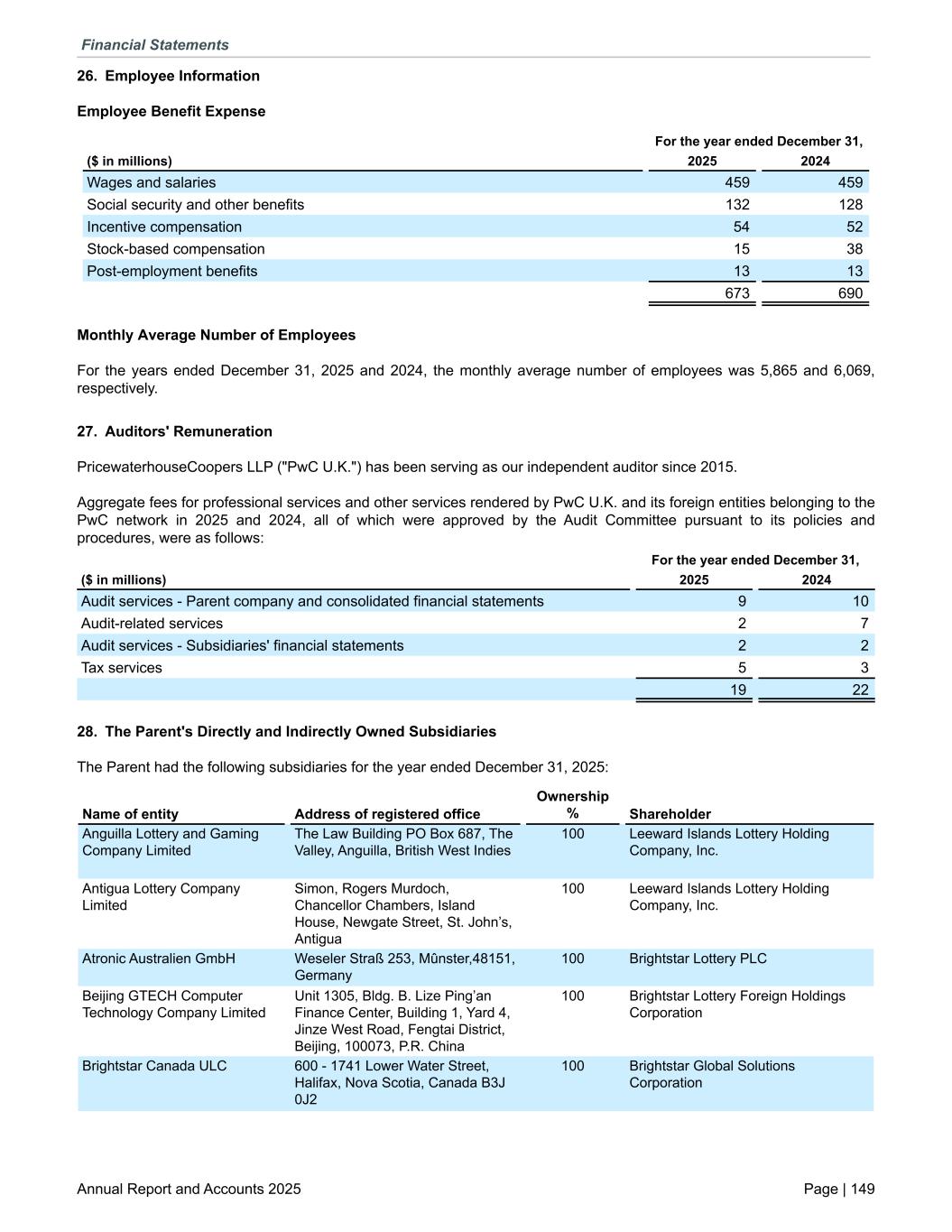 26. Employee Information Employee Benefit Expense For the year ended December 31, ($ in millions) 2025 2024 Wages and salaries 459 459 Social security and other benefits 132 128 Incentive compensation 54 52 Stock-based compensation 15 38 Post-employment benefits 13 13 673 690 Monthly Average Number of Employees For the years ended December 31, 2025 and 2024, the monthly average number of employees was 5,865 and 6,069, respectively. 27. Auditors' Remuneration PricewaterhouseCoopers LLP ("PwC U.K.") has been serving as our independent auditor since 2015. Aggregate fees for professional services and other services rendered by PwC U.K. and its foreign entities belonging to the PwC network in 2025 and 2024, all of which were approved by the Audit Committee pursuant to its policies and procedures, were as follows: For the year ended December 31, ($ in millions) 2025 2024 Audit services - Parent company and consolidated financial statements 9 10 Audit-related services 2 7 Audit services - Subsidiaries' financial statements 2 2 Tax services 5 3 19 22 28. The Parent's Directly and Indirectly Owned Subsidiaries The Parent had the following subsidiaries for the year ended December 31, 2025: Anguilla Lottery and Gaming Company Limited The Law Building PO Box 687, The Valley, Anguilla, British West Indies 100 Leeward Islands Lottery Holding Company, Inc. Antigua Lottery Company Limited Simon, Rogers Murdoch, Chancellor Chambers, Island House, Newgate Street, St. John’s, Antigua 100 Leeward Islands Lottery Holding Company, Inc. Atronic Australien GmbH Weseler Straß 253, Mûnster,48151, Germany 100 Brightstar Lottery PLC Beijing GTECH Computer Technology Company Limited Unit 1305, Bldg. B. Lize Ping’an Finance Center, Building 1, Yard 4, Jinze West Road, Fengtai District, Beijing, 100073, P.R. China 100 Brightstar Lottery Foreign Holdings Corporation Brightstar Canada ULC 600 - 1741 Lower Water Street, Halifax, Nova Scotia, Canada B3J 0J2 100 Brightstar Global Solutions Corporation Name of entity Address of registered office Ownership % Shareholder Financial Statements Annual Report and Accounts 2025 Page | 149