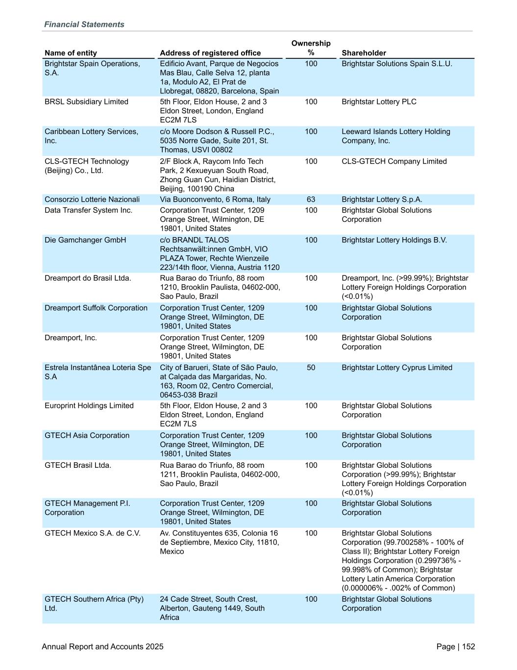 Brightstar Spain Operations, S.A. Edificio Avant, Parque de Negocios Mas Blau, Calle Selva 12, planta 1a, Modulo A2, El Prat de Llobregat, 08820, Barcelona, Spain 100 Brightstar Solutions Spain S.L.U. BRSL Subsidiary Limited 5th Floor, Eldon House, 2 and 3 Eldon Street, London, England EC2M 7LS 100 Brightstar Lottery PLC Caribbean Lottery Services, Inc. c/o Moore Dodson & Russell P.C., 5035 Norre Gade, Suite 201, St. Thomas, USVI 00802 100 Leeward Islands Lottery Holding Company, Inc. CLS-GTECH Technology (Beijing) Co., Ltd. 2/F Block A, Raycom Info Tech Park, 2 Kexueyuan South Road, Zhong Guan Cun, Haidian District, Beijing, 100190 China 100 CLS-GTECH Company Limited Consorzio Lotterie Nazionali Via Buonconvento, 6 Roma, Italy 63 Brightstar Lottery S.p.A. Data Transfer System Inc. Corporation Trust Center, 1209 Orange Street, Wilmington, DE 19801, United States 100 Brightstar Global Solutions Corporation Die Gamchanger GmbH c/o BRANDL TALOS Rechtsanwält:innen GmbH, VIO PLAZA Tower, Rechte Wienzeile 223/14th floor, Vienna, Austria 1120 100 Brightstar Lottery Holdings B.V. Dreamport do Brasil Ltda. Rua Barao do Triunfo, 88 room 1210, Brooklin Paulista, 04602-000, Sao Paulo, Brazil 100 Dreamport, Inc. (>99.99%); Brightstar Lottery Foreign Holdings Corporation (<0.01%) Dreamport Suffolk Corporation Corporation Trust Center, 1209 Orange Street, Wilmington, DE 19801, United States 100 Brightstar Global Solutions Corporation Dreamport, Inc. Corporation Trust Center, 1209 Orange Street, Wilmington, DE 19801, United States 100 Brightstar Global Solutions Corporation Estrela Instantânea Loteria Spe S.A City of Barueri, State of São Paulo, at Calçada das Margaridas, No. 163, Room 02, Centro Comercial, 06453-038 Brazil 50 Brightstar Lottery Cyprus Limited Europrint Holdings Limited 5th Floor, Eldon House, 2 and 3 Eldon Street, London, England EC2M 7LS 100 Brightstar Global Solutions Corporation GTECH Asia Corporation Corporation Trust Center, 1209 Orange Street, Wilmington, DE 19801, United States 100 Brightstar Global Solutions Corporation GTECH Brasil Ltda. Rua Barao do Triunfo, 88 room 1211, Brooklin Paulista, 04602-000, Sao Paulo, Brazil 100 Brightstar Global Solutions Corporation (>99.99%); Brightstar Lottery Foreign Holdings Corporation (<0.01%) GTECH Management P.I. Corporation Corporation Trust Center, 1209 Orange Street, Wilmington, DE 19801, United States 100 Brightstar Global Solutions Corporation GTECH Mexico S.A. de C.V. Av. Constituyentes 635, Colonia 16 de Septiembre, Mexico City, 11810, Mexico 100 Brightstar Global Solutions Corporation (99.700258% - 100% of Class II); Brightstar Lottery Foreign Holdings Corporation (0.299736% - 99.998% of Common); Brightstar Lottery Latin America Corporation (0.000006% - .002% of Common) GTECH Southern Africa (Pty) Ltd. 24 Cade Street, South Crest, Alberton, Gauteng 1449, South Africa 100 Brightstar Global Solutions Corporation Name of entity Address of registered office Ownership % Shareholder Financial Statements Annual Report and Accounts 2025 Page | 152