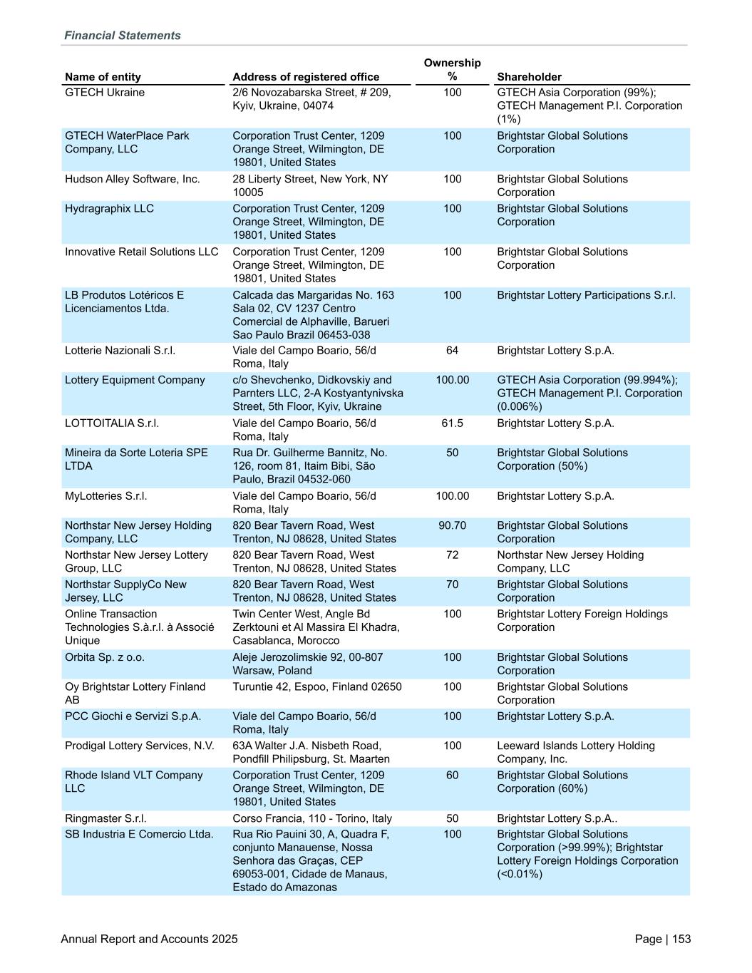 GTECH Ukraine 2/6 Novozabarska Street, # 209, Kyiv, Ukraine, 04074 100 GTECH Asia Corporation (99%); GTECH Management P.I. Corporation (1%) GTECH WaterPlace Park Company, LLC Corporation Trust Center, 1209 Orange Street, Wilmington, DE 19801, United States 100 Brightstar Global Solutions Corporation Hudson Alley Software, Inc. 28 Liberty Street, New York, NY 10005 100 Brightstar Global Solutions Corporation Hydragraphix LLC Corporation Trust Center, 1209 Orange Street, Wilmington, DE 19801, United States 100 Brightstar Global Solutions Corporation Innovative Retail Solutions LLC Corporation Trust Center, 1209 Orange Street, Wilmington, DE 19801, United States 100 Brightstar Global Solutions Corporation LB Produtos Lotéricos E Licenciamentos Ltda. Calcada das Margaridas No. 163 Sala 02, CV 1237 Centro Comercial de Alphaville, Barueri Sao Paulo Brazil 06453-038 100 Brightstar Lottery Participations S.r.l. Lotterie Nazionali S.r.l. Viale del Campo Boario, 56/d Roma, Italy 64 Brightstar Lottery S.p.A. Lottery Equipment Company c/o Shevchenko, Didkovskiy and Parnters LLC, 2-A Kostyantynivska Street, 5th Floor, Kyiv, Ukraine 100.00 GTECH Asia Corporation (99.994%); GTECH Management P.I. Corporation (0.006%) LOTTOITALIA S.r.l. Viale del Campo Boario, 56/d Roma, Italy 61.5 Brightstar Lottery S.p.A. Mineira da Sorte Loteria SPE LTDA Rua Dr. Guilherme Bannitz, No. 126, room 81, Itaim Bibi, São Paulo, Brazil 04532-060 50 Brightstar Global Solutions Corporation (50%) MyLotteries S.r.l. Viale del Campo Boario, 56/d Roma, Italy 100.00 Brightstar Lottery S.p.A. Northstar New Jersey Holding Company, LLC 820 Bear Tavern Road, West Trenton, NJ 08628, United States 90.70 Brightstar Global Solutions Corporation Northstar New Jersey Lottery Group, LLC 820 Bear Tavern Road, West Trenton, NJ 08628, United States 72 Northstar New Jersey Holding Company, LLC Northstar SupplyCo New Jersey, LLC 820 Bear Tavern Road, West Trenton, NJ 08628, United States 70 Brightstar Global Solutions Corporation Online Transaction Technologies S.à.r.l. à Associé Unique Twin Center West, Angle Bd Zerktouni et Al Massira El Khadra, Casablanca, Morocco 100 Brightstar Lottery Foreign Holdings Corporation Orbita Sp. z o.o. Aleje Jerozolimskie 92, 00-807 Warsaw, Poland 100 Brightstar Global Solutions Corporation Oy Brightstar Lottery Finland AB Turuntie 42, Espoo, Finland 02650 100 Brightstar Global Solutions Corporation PCC Giochi e Servizi S.p.A. Viale del Campo Boario, 56/d Roma, Italy 100 Brightstar Lottery S.p.A. Prodigal Lottery Services, N.V. 63A Walter J.A. Nisbeth Road, Pondfill Philipsburg, St. Maarten 100 Leeward Islands Lottery Holding Company, Inc. Rhode Island VLT Company LLC Corporation Trust Center, 1209 Orange Street, Wilmington, DE 19801, United States 60 Brightstar Global Solutions Corporation (60%) Ringmaster S.r.l. Corso Francia, 110 - Torino, Italy 50 Brightstar Lottery S.p.A.. SB Industria E Comercio Ltda. Rua Rio Pauini 30, A, Quadra F, conjunto Manauense, Nossa Senhora das Graças, CEP 69053-001, Cidade de Manaus, Estado do Amazonas 100 Brightstar Global Solutions Corporation (˃99.99%); Brightstar Lottery Foreign Holdings Corporation (˂0.01%) Name of entity Address of registered office Ownership % Shareholder Financial Statements Annual Report and Accounts 2025 Page | 153
