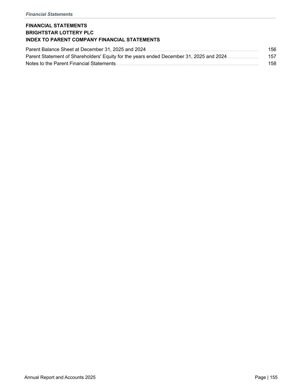 FINANCIAL STATEMENTS BRIGHTSTAR LOTTERY PLC INDEX TO PARENT COMPANY FINANCIAL STATEMENTS Parent Balance Sheet at December 31, 2025 and 2024 ........................................................................................... 156 Parent Statement of Shareholders' Equity for the years ended December 31, 2025 and 2024 .......................... 157 Notes to the Parent Financial Statements .................................................................................................................... 158 Financial Statements Annual Report and Accounts 2025 Page | 155