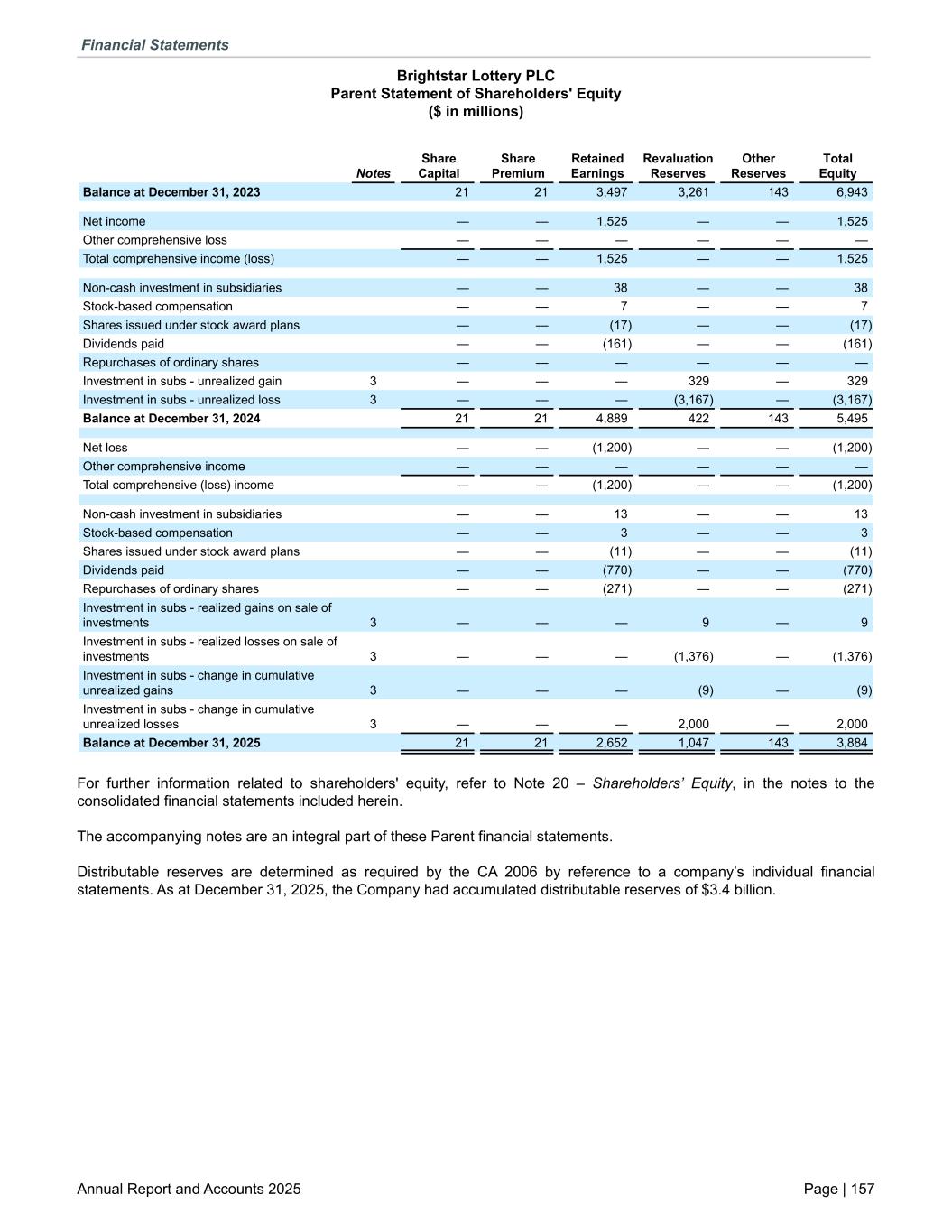Brightstar Lottery PLC Parent Statement of Shareholders' Equity ($ in millions) Notes Share Capital Share Premium Retained Earnings Revaluation Reserves Other Reserves Total Equity Balance at December 31, 2023 21 21 3,497 3,261 143 6,943 Net income — — 1,525 — — 1,525 Other comprehensive loss — — — — — — Total comprehensive income (loss) — — 1,525 — — 1,525 Non-cash investment in subsidiaries — — 38 — — 38 Stock-based compensation — — 7 — — 7 Shares issued under stock award plans — — (17) — — (17) Dividends paid — — (161) — — (161) Repurchases of ordinary shares — — — — — — Investment in subs - unrealized gain 3 — — — 329 — 329 Investment in subs - unrealized loss 3 — — — (3,167) — (3,167) Balance at December 31, 2024 21 21 4,889 422 143 5,495 Net loss — — (1,200) — — (1,200) Other comprehensive income — — — — — — Total comprehensive (loss) income — — (1,200) — — (1,200) Non-cash investment in subsidiaries — — 13 — — 13 Stock-based compensation — — 3 — — 3 Shares issued under stock award plans — — (11) — — (11) Dividends paid — — (770) — — (770) Repurchases of ordinary shares — — (271) — — (271) Investment in subs - realized gains on sale of investments 3 — — — 9 — 9 Investment in subs - realized losses on sale of investments 3 — — — (1,376) — (1,376) Investment in subs - change in cumulative unrealized gains 3 — — — (9) — (9) Investment in subs - change in cumulative unrealized losses 3 — — — 2,000 — 2,000 Balance at December 31, 2025 21 21 2,652 1,047 143 3,884 For further information related to shareholders' equity, refer to Note 20 – Shareholders’ Equity, in the notes to the consolidated financial statements included herein. The accompanying notes are an integral part of these Parent financial statements. Distributable reserves are determined as required by the CA 2006 by reference to a company’s individual financial statements. As at December 31, 2025, the Company had accumulated distributable reserves of $3.4 billion. Financial Statements Annual Report and Accounts 2025 Page | 157