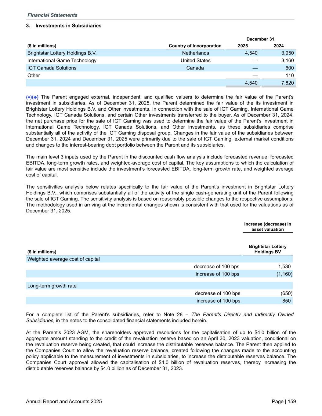 3. Investments in Subsidiaries Country of Incorporation December 31, ($ in millions) 2025 2024 Brightstar Lottery Holdings B.V. Netherlands 4,540 3,950 International Game Technology United States — 3,160 IGT Canada Solutions Canada — 600 Other — 110 4,540 7,820 (♦)(♣) The Parent engaged external, independent, and qualified valuers to determine the fair value of the Parent’s investment in subsidiaries. As of December 31, 2025, the Parent determined the fair value of the its investment in Brightstar Lottery Holdings B.V. and Other investments. In connection with the sale of IGT Gaming, International Game Technology, IGT Canada Solutions, and certain Other investments transferred to the buyer. As of December 31, 2024, the net purchase price for the sale of IGT Gaming was used to determine the fair value of the Parent’s investment in International Game Technology, IGT Canada Solutions, and Other investments, as these subsidiaries comprise substantially all of the activity of the IGT Gaming disposal group. Changes in the fair value of the subsidiaries between December 31, 2024 and December 31, 2025 were primarily due to the sale of IGT Gaming, external market conditions and changes to the interest-bearing debt portfolio between the Parent and its subsidiaries. The main level 3 inputs used by the Parent in the discounted cash flow analysis include forecasted revenue, forecasted EBITDA, long-term growth rates, and weighted-average cost of capital. The key assumptions to which the calculation of fair value are most sensitive include the investment’s forecasted EBITDA, long-term growth rate, and weighted average cost of capital. The sensitivities analysis below relates specifically to the fair value of the Parent’s investment in Brightstar Lottery Holdings B.V., which comprises substantially all of the activity of the single cash-generating unit of the Parent following the sale of IGT Gaming. The sensitivity analysis is based on reasonably possible changes to the respective assumptions. The methodology used in arriving at the incremental changes shown is consistent with that used for the valuations as of December 31, 2025. ($ in millions) Increase (decrease) in asset valuation Brightstar Lottery Holdings BV Weighted average cost of capital decrease of 100 bps 1,530 increase of 100 bps (1,160) Long-term growth rate decrease of 100 bps (650) increase of 100 bps 850 For a complete list of the Parent's subsidiaries, refer to Note 28 – The Parent's Directly and Indirectly Owned Subsidiaries, in the notes to the consolidated financial statements included herein. At the Parent’s 2023 AGM, the shareholders approved resolutions for the capitalisation of up to $4.0 billion of the aggregate amount standing to the credit of the revaluation reserve based on an April 30, 2023 valuation, conditional on the revaluation reserve being created, that could increase the distributable reserves balance. The Parent then applied to the Companies Court to allow the revaluation reserve balance, created following the changes made to the accounting policy applicable to the measurement of investments in subsidiaries, to increase the distributable reserves balance. The Companies Court approval allowed the capitalisation of $4.0 billion of revaluation reserves, thereby increasing the distributable reserves balance by $4.0 billion as of December 31, 2023. Financial Statements Annual Report and Accounts 2025 Page | 159