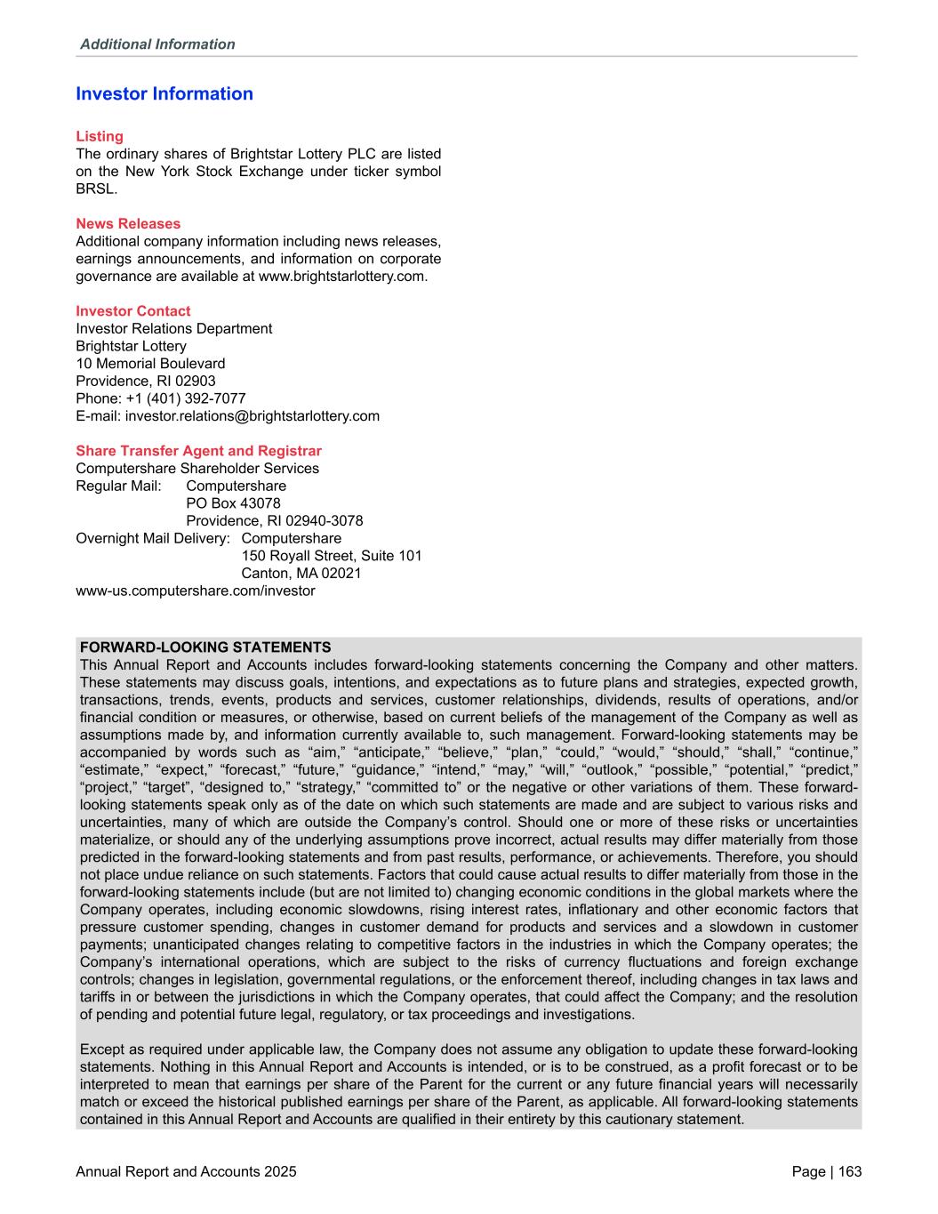 Investor Information Listing The ordinary shares of Brightstar Lottery PLC are listed on the New York Stock Exchange under ticker symbol BRSL. News Releases Additional company information including news releases, earnings announcements, and information on corporate governance are available at www.brightstarlottery.com. Investor Contact Investor Relations Department Brightstar Lottery 10 Memorial Boulevard Providence, RI 02903 Phone: +1 (401) 392-7077 E-mail: investor.relations@brightstarlottery.com Share Transfer Agent and Registrar Computershare Shareholder Services Regular Mail: Computershare PO Box 43078 Providence, RI 02940-3078 Overnight Mail Delivery: Computershare 150 Royall Street, Suite 101 Canton, MA 02021 www-us.computershare.com/investor FORWARD-LOOKING STATEMENTS This Annual Report and Accounts includes forward-looking statements concerning the Company and other matters. These statements may discuss goals, intentions, and expectations as to future plans and strategies, expected growth, transactions, trends, events, products and services, customer relationships, dividends, results of operations, and/or financial condition or measures, or otherwise, based on current beliefs of the management of the Company as well as assumptions made by, and information currently available to, such management. Forward-looking statements may be accompanied by words such as “aim,” “anticipate,” “believe,” “plan,” “could,” “would,” “should,” “shall,” “continue,” “estimate,” “expect,” “forecast,” “future,” “guidance,” “intend,” “may,” “will,” “outlook,” “possible,” “potential,” “predict,” “project,” “target”, “designed to,” “strategy,” “committed to” or the negative or other variations of them. These forward- looking statements speak only as of the date on which such statements are made and are subject to various risks and uncertainties, many of which are outside the Company’s control. Should one or more of these risks or uncertainties materialize, or should any of the underlying assumptions prove incorrect, actual results may differ materially from those predicted in the forward-looking statements and from past results, performance, or achievements. Therefore, you should not place undue reliance on such statements. Factors that could cause actual results to differ materially from those in the forward-looking statements include (but are not limited to) changing economic conditions in the global markets where the Company operates, including economic slowdowns, rising interest rates, inflationary and other economic factors that pressure customer spending, changes in customer demand for products and services and a slowdown in customer payments; unanticipated changes relating to competitive factors in the industries in which the Company operates; the Company’s international operations, which are subject to the risks of currency fluctuations and foreign exchange controls; changes in legislation, governmental regulations, or the enforcement thereof, including changes in tax laws and tariffs in or between the jurisdictions in which the Company operates, that could affect the Company; and the resolution of pending and potential future legal, regulatory, or tax proceedings and investigations. Except as required under applicable law, the Company does not assume any obligation to update these forward-looking statements. Nothing in this Annual Report and Accounts is intended, or is to be construed, as a profit forecast or to be interpreted to mean that earnings per share of the Parent for the current or any future financial years will necessarily match or exceed the historical published earnings per share of the Parent, as applicable. All forward-looking statements contained in this Annual Report and Accounts are qualified in their entirety by this cautionary statement. Additional Information Annual Report and Accounts 2025 Page | 163