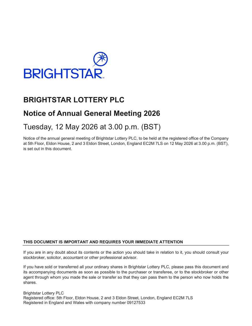 Brightstar Lottery PLC Registered office: 5th Floor, Eldon House, 2 and 3 Eldon Street, London, England EC2M 7LS Registered in England and Wales with company number 09127533 BRIGHTSTAR LOTTERY PLC Notice of Annual General Meeting 2026 Tuesday, 12 May 2026 at 3.00 p.m. (BST) Notice of the annual general meeting of Brightstar Lottery PLC, to be held at the registered office of the Company at 5th Floor, Eldon House, 2 and 3 Eldon Street, London, England EC2M 7LS on 12 May 2026 at 3.00 p.m. (BST), is set out in this document. THIS DOCUMENT IS IMPORTANT AND REQUIRES YOUR IMMEDIATE ATTENTION If you are in any doubt about its contents or the action you should take in relation to it, you should consult your stockbroker, solicitor, accountant or other professional advisor. If you have sold or transferred all your ordinary shares in Brightstar Lottery PLC, please pass this document and its accompanying documents as soon as possible to the purchaser or transferee, or to the stockbroker or other agent through whom you made the sale or transfer so that they can pass them to the person who now holds the shares.