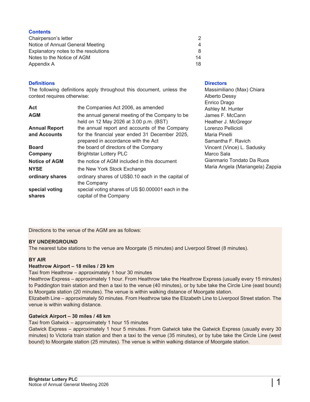 Brightstar Lottery PLC Notice of Annual General Meeting 2026 | 1 Contents Chairperson’s letter 2 Notice of Annual General Meeting 4 Explanatory notes to the resolutions 8 Notes to the Notice of AGM 14 Appendix A 18 Definitions The following definitions apply throughout this document, unless the context requires otherwise: Act the Companies Act 2006, as amended AGM the annual general meeting of the Company to be held on 12 May 2026 at 3.00 p.m. (BST) Annual Report and Accounts the annual report and accounts of the Company for the financial year ended 31 December 2025, prepared in accordance with the Act Board the board of directors of the Company Company Brightstar Lottery PLC Notice of AGM the notice of AGM included in this document NYSE the New York Stock Exchange ordinary shares ordinary shares of US$0.10 each in the capital of the Company special voting shares special voting shares of US $0.000001 each in the capital of the Company Directors Massimiliano (Max) Chiara Alberto Dessy Enrico Drago Ashley M. Hunter James F. McCann Heather J. McGregor Lorenzo Pellicioli Maria Pinelli Samantha F. Ravich Vincent (Vince) L. Sadusky Marco Sala Gianmario Tondato Da Ruos Maria Angela (Mariangela) Zappia Directions to the venue of the AGM are as follows: BY UNDERGROUND The nearest tube stations to the venue are Moorgate (5 minutes) and Liverpool Street (8 minutes). BY AIR Heathrow Airport – 18 miles / 29 km Taxi from Heathrow – approximately 1 hour 30 minutes Heathrow Express – approximately 1 hour. From Heathrow take the Heathrow Express (usually every 15 minutes) to Paddington train station and then a taxi to the venue (40 minutes), or by tube take the Circle Line (east bound) to Moorgate station (20 minutes). The venue is within walking distance of Moorgate station. Elizabeth Line – approximately 50 minutes. From Heathrow take the Elizabeth Line to Liverpool Street station. The venue is within walking distance. Gatwick Airport – 30 miles / 48 km Taxi from Gatwick – approximately 1 hour 15 minutes Gatwick Express – approximately 1 hour 5 minutes. From Gatwick take the Gatwick Express (usually every 30 minutes) to Victoria train station and then a taxi to the venue (35 minutes), or by tube take the Circle Line (west bound) to Moorgate station (25 minutes). The venue is within walking distance of Moorgate station.