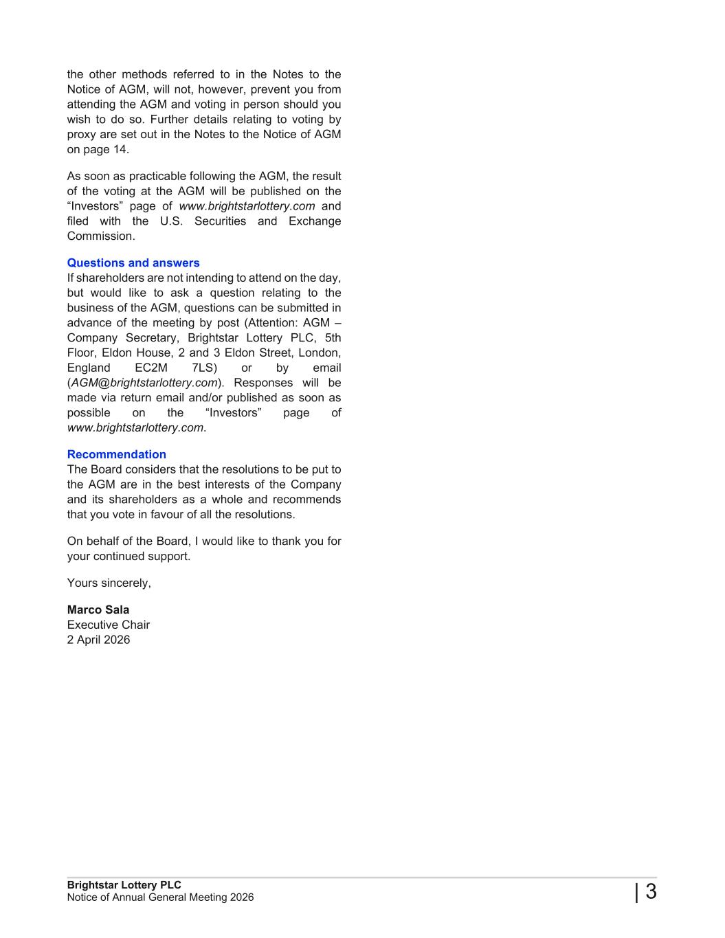 Brightstar Lottery PLC Notice of Annual General Meeting 2026 | 3 the other methods referred to in the Notes to the Notice of AGM, will not, however, prevent you from attending the AGM and voting in person should you wish to do so. Further details relating to voting by proxy are set out in the Notes to the Notice of AGM on page 14. As soon as practicable following the AGM, the result of the voting at the AGM will be published on the “Investors” page of www.brightstarlottery.com and filed with the U.S. Securities and Exchange Commission. Questions and answers If shareholders are not intending to attend on the day, but would like to ask a question relating to the business of the AGM, questions can be submitted in advance of the meeting by post (Attention: AGM – Company Secretary, Brightstar Lottery PLC, 5th Floor, Eldon House, 2 and 3 Eldon Street, London, England EC2M 7LS) or by email (AGM@brightstarlottery.com). Responses will be made via return email and/or published as soon as possible on the “Investors” page of www.brightstarlottery.com. Recommendation The Board considers that the resolutions to be put to the AGM are in the best interests of the Company and its shareholders as a whole and recommends that you vote in favour of all the resolutions. On behalf of the Board, I would like to thank you for your continued support. Yours sincerely, Marco Sala Executive Chair 2 April 2026