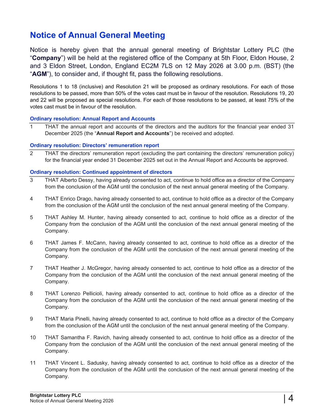 Brightstar Lottery PLC Notice of Annual General Meeting 2026 | 4 Notice of Annual General Meeting Notice is hereby given that the annual general meeting of Brightstar Lottery PLC (the “Company”) will be held at the registered office of the Company at 5th Floor, Eldon House, 2 and 3 Eldon Street, London, England EC2M 7LS on 12 May 2026 at 3.00 p.m. (BST) (the “AGM”), to consider and, if thought fit, pass the following resolutions. Resolutions 1 to 18 (inclusive) and Resolution 21 will be proposed as ordinary resolutions. For each of those resolutions to be passed, more than 50% of the votes cast must be in favour of the resolution. Resolutions 19, 20 and 22 will be proposed as special resolutions. For each of those resolutions to be passed, at least 75% of the votes cast must be in favour of the resolution. Ordinary resolution: Annual Report and Accounts 1 THAT the annual report and accounts of the directors and the auditors for the financial year ended 31 December 2025 (the “Annual Report and Accounts”) be received and adopted. Ordinary resolution: Directors’ remuneration report 2 THAT the directors’ remuneration report (excluding the part containing the directors’ remuneration policy) for the financial year ended 31 December 2025 set out in the Annual Report and Accounts be approved. Ordinary resolution: Continued appointment of directors 3 THAT Alberto Dessy, having already consented to act, continue to hold office as a director of the Company from the conclusion of the AGM until the conclusion of the next annual general meeting of the Company. 4 THAT Enrico Drago, having already consented to act, continue to hold office as a director of the Company from the conclusion of the AGM until the conclusion of the next annual general meeting of the Company. 5 THAT Ashley M. Hunter, having already consented to act, continue to hold office as a director of the Company from the conclusion of the AGM until the conclusion of the next annual general meeting of the Company. 6 THAT James F. McCann, having already consented to act, continue to hold office as a director of the Company from the conclusion of the AGM until the conclusion of the next annual general meeting of the Company. 7 THAT Heather J. McGregor, having already consented to act, continue to hold office as a director of the Company from the conclusion of the AGM until the conclusion of the next annual general meeting of the Company. 8 THAT Lorenzo Pellicioli, having already consented to act, continue to hold office as a director of the Company from the conclusion of the AGM until the conclusion of the next annual general meeting of the Company. 9 THAT Maria Pinelli, having already consented to act, continue to hold office as a director of the Company from the conclusion of the AGM until the conclusion of the next annual general meeting of the Company. 10 THAT Samantha F. Ravich, having already consented to act, continue to hold office as a director of the Company from the conclusion of the AGM until the conclusion of the next annual general meeting of the Company. 11 THAT Vincent L. Sadusky, having already consented to act, continue to hold office as a director of the Company from the conclusion of the AGM until the conclusion of the next annual general meeting of the Company.