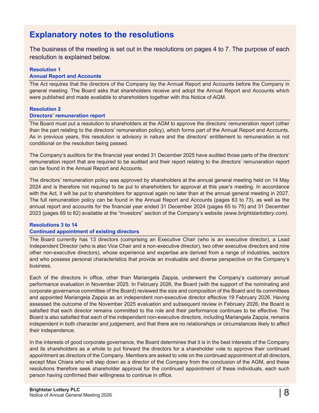 Brightstar Lottery PLC Notice of Annual General Meeting 2026 | 8 Explanatory notes to the resolutions The business of the meeting is set out in the resolutions on pages 4 to 7. The purpose of each resolution is explained below. Resolution 1 Annual Report and Accounts The Act requires that the directors of the Company lay the Annual Report and Accounts before the Company in general meeting. The Board asks that shareholders receive and adopt the Annual Report and Accounts which were published and made available to shareholders together with this Notice of AGM. Resolution 2 Directors’ remuneration report The Board must put a resolution to shareholders at the AGM to approve the directors’ remuneration report (other than the part relating to the directors’ remuneration policy), which forms part of the Annual Report and Accounts. As in previous years, this resolution is advisory in nature and the directors’ entitlement to remuneration is not conditional on the resolution being passed. The Company’s auditors for the financial year ended 31 December 2025 have audited those parts of the directors’ remuneration report that are required to be audited and their report relating to the directors’ remuneration report can be found in the Annual Report and Accounts. The directors’ remuneration policy was approved by shareholders at the annual general meeting held on 14 May 2024 and is therefore not required to be put to shareholders for approval at this year’s meeting. In accordance with the Act, it will be put to shareholders for approval again no later than at the annual general meeting in 2027. The full remuneration policy can be found in the Annual Report and Accounts (pages 63 to 73), as well as the annual report and accounts for the financial year ended 31 December 2024 (pages 65 to 75) and 31 December 2023 (pages 69 to 82) available at the “Investors” section of the Company’s website (www.brightstarlottery.com). Resolutions 3 to 14 Continued appointment of existing directors The Board currently has 13 directors (comprising an Executive Chair (who is an executive director), a Lead Independent Director (who is also Vice Chair and a non-executive director), two other executive directors and nine other non-executive directors), whose experience and expertise are derived from a range of industries, sectors and who possess personal characteristics that provide an invaluable and diverse perspective on the Company’s business. Each of the directors in office, other than Mariangela Zappia, underwent the Company’s customary annual performance evaluation in November 2025. In February 2026, the Board (with the support of the nominating and corporate governance committee of the Board) reviewed the size and composition of the Board and its committees and appointed Mariangela Zappia as an independent non-executive director effective 19 February 2026. Having assessed the outcome of the November 2025 evaluation and subsequent review in February 2026, the Board is satisfied that each director remains committed to the role and their performance continues to be effective. The Board is also satisfied that each of the independent non-executive directors, including Mariangela Zappia, remains independent in both character and judgement, and that there are no relationships or circumstances likely to affect their independence. In the interests of good corporate governance, the Board determines that it is in the best interests of the Company and its shareholders as a whole to put forward the directors for a shareholder vote to approve their continued appointment as directors of the Company. Members are asked to vote on the continued appointment of all directors, except Max Chiara who will step down as a director of the Company from the conclusion of the AGM, and these resolutions therefore seek shareholder approval for the continued appointment of these individuals, each such person having confirmed their willingness to continue in office.