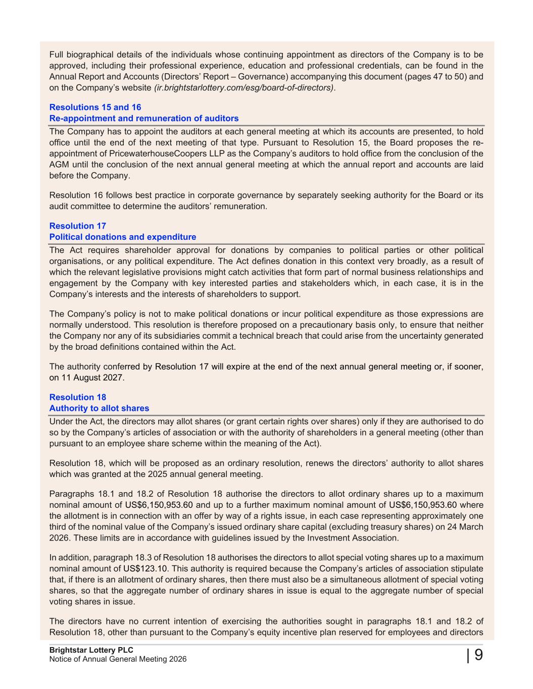 Brightstar Lottery PLC Notice of Annual General Meeting 2026 | 9 Full biographical details of the individuals whose continuing appointment as directors of the Company is to be approved, including their professional experience, education and professional credentials, can be found in the Annual Report and Accounts (Directors’ Report – Governance) accompanying this document (pages 47 to 50) and on the Company’s website (ir.brightstarlottery.com/esg/board-of-directors). Resolutions 15 and 16 Re-appointment and remuneration of auditors The Company has to appoint the auditors at each general meeting at which its accounts are presented, to hold office until the end of the next meeting of that type. Pursuant to Resolution 15, the Board proposes the re- appointment of PricewaterhouseCoopers LLP as the Company’s auditors to hold office from the conclusion of the AGM until the conclusion of the next annual general meeting at which the annual report and accounts are laid before the Company. Resolution 16 follows best practice in corporate governance by separately seeking authority for the Board or its audit committee to determine the auditors’ remuneration. Resolution 17 Political donations and expenditure The Act requires shareholder approval for donations by companies to political parties or other political organisations, or any political expenditure. The Act defines donation in this context very broadly, as a result of which the relevant legislative provisions might catch activities that form part of normal business relationships and engagement by the Company with key interested parties and stakeholders which, in each case, it is in the Company’s interests and the interests of shareholders to support. The Company’s policy is not to make political donations or incur political expenditure as those expressions are normally understood. This resolution is therefore proposed on a precautionary basis only, to ensure that neither the Company nor any of its subsidiaries commit a technical breach that could arise from the uncertainty generated by the broad definitions contained within the Act. The authority conferred by Resolution 17 will expire at the end of the next annual general meeting or, if sooner, on 11 August 2027. Resolution 18 Authority to allot shares Under the Act, the directors may allot shares (or grant certain rights over shares) only if they are authorised to do so by the Company’s articles of association or with the authority of shareholders in a general meeting (other than pursuant to an employee share scheme within the meaning of the Act). Resolution 18, which will be proposed as an ordinary resolution, renews the directors’ authority to allot shares which was granted at the 2025 annual general meeting. Paragraphs 18.1 and 18.2 of Resolution 18 authorise the directors to allot ordinary shares up to a maximum nominal amount of US$6,150,953.60 and up to a further maximum nominal amount of US$6,150,953.60 where the allotment is in connection with an offer by way of a rights issue, in each case representing approximately one third of the nominal value of the Company’s issued ordinary share capital (excluding treasury shares) on 24 March 2026. These limits are in accordance with guidelines issued by the Investment Association. In addition, paragraph 18.3 of Resolution 18 authorises the directors to allot special voting shares up to a maximum nominal amount of US$123.10. This authority is required because the Company’s articles of association stipulate that, if there is an allotment of ordinary shares, then there must also be a simultaneous allotment of special voting shares, so that the aggregate number of ordinary shares in issue is equal to the aggregate number of special voting shares in issue. The directors have no current intention of exercising the authorities sought in paragraphs 18.1 and 18.2 of Resolution 18, other than pursuant to the Company’s equity incentive plan reserved for employees and directors