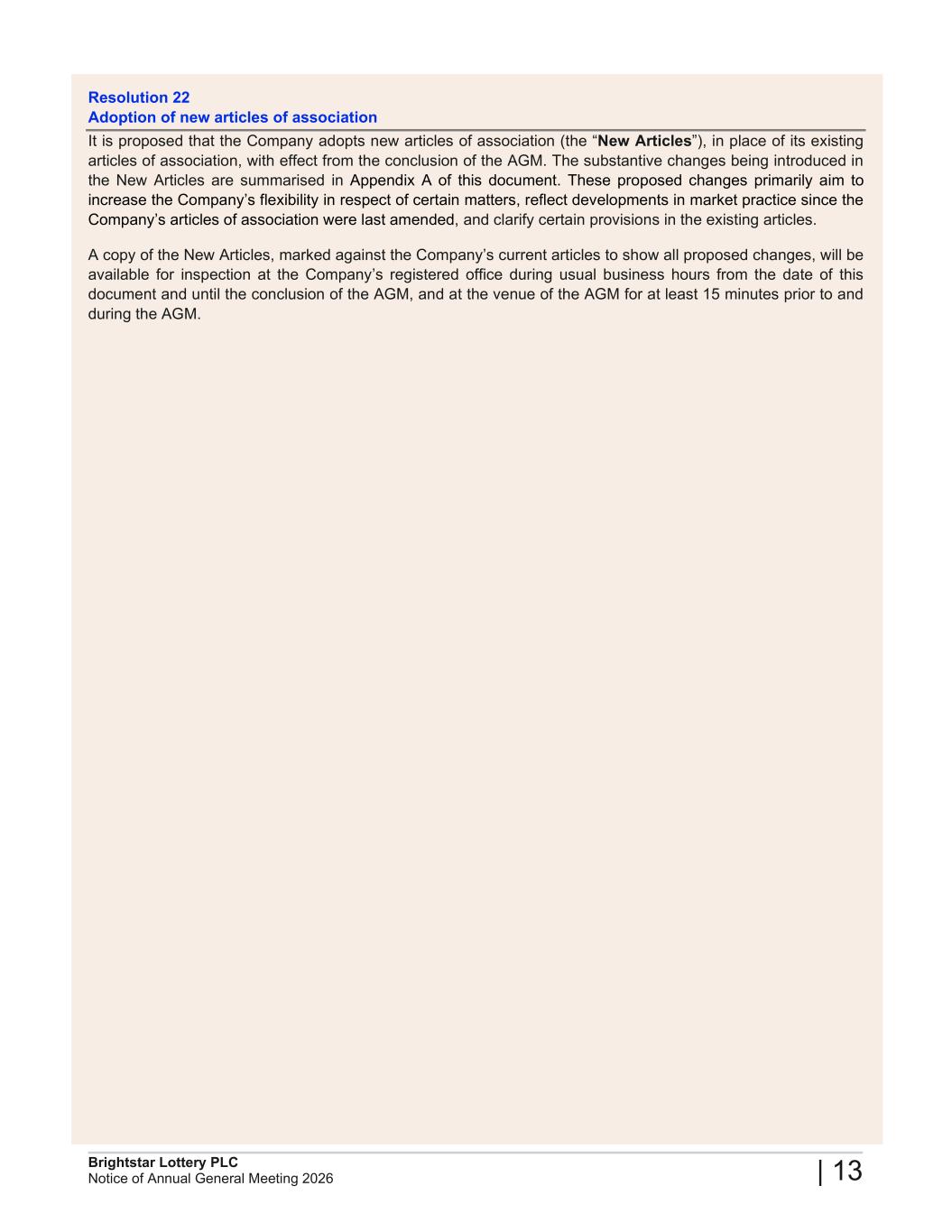Brightstar Lottery PLC Notice of Annual General Meeting 2026 | 13 Resolution 22 Adoption of new articles of association It is proposed that the Company adopts new articles of association (the “New Articles”), in place of its existing articles of association, with effect from the conclusion of the AGM. The substantive changes being introduced in the New Articles are summarised in Appendix A of this document. These proposed changes primarily aim to increase the Company’s flexibility in respect of certain matters, reflect developments in market practice since the Company’s articles of association were last amended, and clarify certain provisions in the existing articles. A copy of the New Articles, marked against the Company’s current articles to show all proposed changes, will be available for inspection at the Company’s registered office during usual business hours from the date of this document and until the conclusion of the AGM, and at the venue of the AGM for at least 15 minutes prior to and during the AGM.