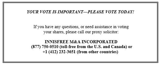 Your vote is very important. Please note that failing to vote will have the same effect as a vote against the Merger. If you have not already done so, please vote TODAY via the Internet, telephone, or by signing, dating, and returning the enclosed proxy card or voting instruction form in the envelope provided. If you received this letter by email, you may simply click on the “VOTE NOW” link provided in the email.