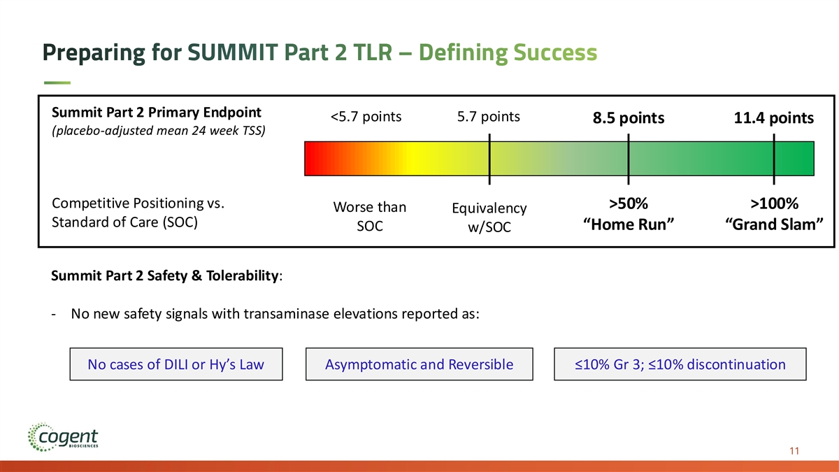 Preparing for SUMMIT Part 2 TLR – Defining Success Summit Part 2 Primary Endpoint <5.7 points 5.7 points 8.5 points 11.4 points (placebo-adjusted mean 24 week TSS) Competitive Positioning vs. >50% >100% Worse than Equivalency Standard of Care (SOC) “Home Run” “Grand Slam” SOC w/SOC Summit Part 2 Safety & Tolerability: - No new safety signals with transaminase elevations reported as: No cases of DILI or Hy’s Law Asymptomatic and Reversible ≤10% Gr 3; ≤10% discontinuation 11