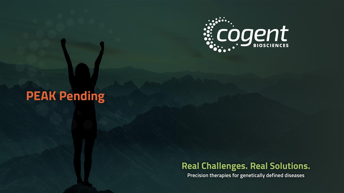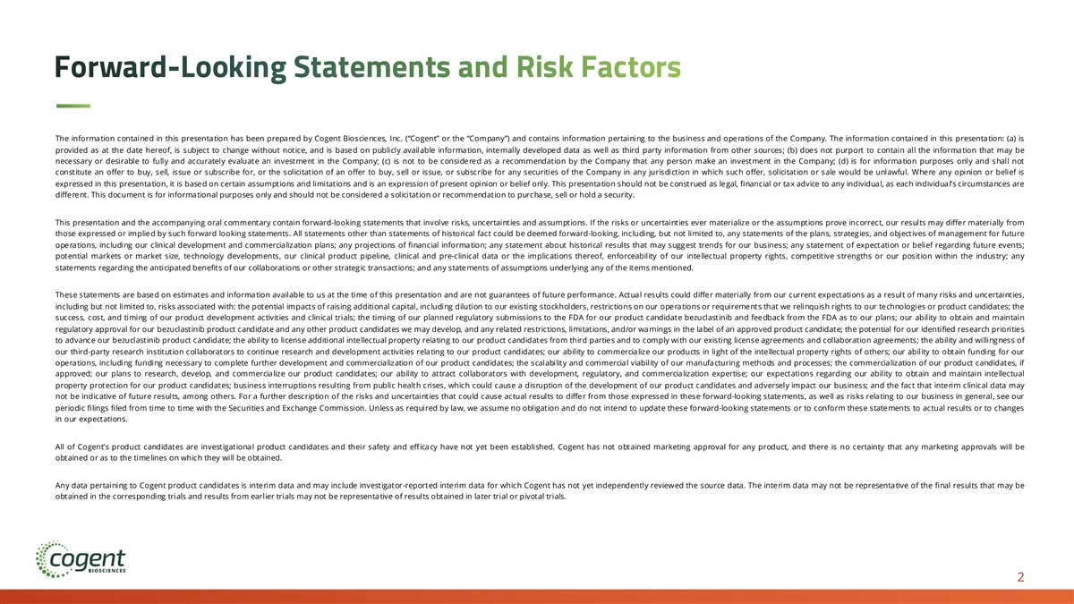 Forward-Looking Statements and Risk Factors The information contained in this presentation has been prepared by Cogent Biosciences, Inc. (“Cogent” or the “Company”) and contains information pertaining to the business and operations of the Company. The information contained in this presentation: (a) is provided as at the date hereof, is subject to change without notice, and is based on publicly available information, internally developed data as well as third party information from other sources; (b) does not purport to contain all the information that may be necessary or desirable to fully and accurately evaluate an investment in the Company; (c) is not to be considered as a recommendation by the Company that any person make an investment in the Company; (d) is for information purposes only and shall not constitute an offer to buy, sell, issue or subscribe for, or the solicitation of an offer to buy, sell or issue, or subscribe for any securities of the Company in any jurisdiction in which such offer, solicitation or sale would be unlawful. Where any opinion or belief is expressed in this presentation, it is based on certain assumptions and limitations and is an expression of present opinion or belief only. This presentation should not be construed as legal, financial or tax advice to any individual, as each individual’s circumstances are different. This document is for informational purposes only and should not be considered a solicitation or recommendation to purchase, sell or hold a security. This presentation and the accompanying oral commentary contain forward-looking statements that involve risks, uncertainties and assumptions. If the risks or uncertainties ever materialize or the assumptions prove incorrect, our results may differ materially from those expressed or implied by such forward looking statements. All statements other than statements of historical fact could be deemed forward-looking, including, but not limited to, any statements of the plans, strategies, and objectives of management for future operations, including our clinical development and commercialization plans; any projections of financial information; any statement about historical results that may suggest trends for our business; any statement of expectation or belief regarding future events; potential markets or market size, technology developments, our clinical product pipeline, clinical and pre-clinical data or the implications thereof, enforceability of our intellectual property rights, competitive strengths or our position within the industry; any statements regarding the anticipated benefits of our collaborations or other strategic transactions; and any statements of assumptions underlying any of the items mentioned. These statements are based on estimates and information available to us at the time of this presentation and are not guarantees of future performance. Actual results could differ materially from our current expectations as a result of many risks and uncertainties, including but not limited to, risks associated with: the potential impacts of raising additional capital, including dilution to our existing stockholders, restrictions on our operations or requirements that we relinquish rights to our technologies or product candidates; the success, cost, and timing of our product development activities and clinical trials; the timing of our planned regulatory submissions to the FDA for our product candidate bezuclastinib and feedback from the FDA as to our plans; our ability to obtain and maintain regulatory approval for our bezuclastinib product candidate and any other product candidates we may develop, and any related restrictions, limitations, and/or warnings in the label of an approved product candidate; the potential for our identified research priorities to advance our bezuclastinib product candidate; the ability to license additional intellectual property relating to our product candidates from third parties and to comply with our existing license agreements and collaboration agreements; the ability and willingness of our third-party research institution collaborators to continue research and development activities relating to our product candidates; our ability to commercialize our products in light of the intellectual property rights of others; our ability to obtain funding for our operations, including funding necessary to complete further development and commercialization of our product candidates; the scalability and commercial viability of our manufacturing methods and processes; the commercialization of our product candidates, if approved; our plans to research, develop, and commercialize our product candidates; our ability to attract collaborators with development, regulatory, and commercialization expertise; our expectations regarding our ability to obtain and maintain intellectual property protection for our product candidates; business interruptions resulting from public health crises, which could cause a disruption of the development of our product candidates and adversely impact our business; and the fact that interim clinical data may not be indicative of future results, among others. For a further description of the risks and uncertainties that could cause actual results to differ from those expressed in these forward-looking statements, as well as risks relating to our business in general, see our periodic filings filed from time to time with the Securities and Exchange Commission. Unless as required by law, we assume no obligation and do not intend to update these forward-looking statements or to conform these statements to actual results or to changes in our expectations. All of Cogent’s product candidates are investigational product candidates and their safety and efficacy have not yet been established. Cogent has not obtained marketing approval for any product, and there is no certainty that any marketing approvals will be obtained or as to the timelines on w