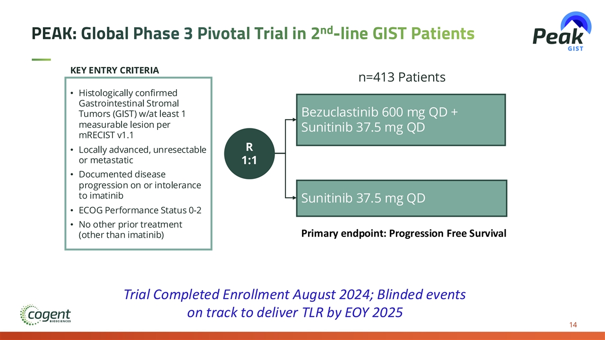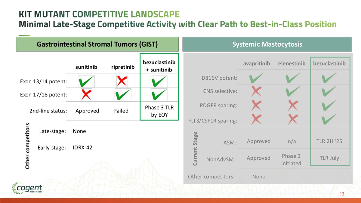 KIT MUTANT COMPETITIVE LANDSCAPE Minimal Late-Stage Competitive Activity with Clear Path to Best-in-Class Position Gastrointestinal Stromal Tumors (GIST) Systemic Mastocytosis bezuclastinib avapritinib elenestinib bezuclastinib sunitinib ripretinib + sunitinib D816V potent: Exon 13/14 potent: CNS selective: Exon 17/18 potent: PDGFR sparing: Phase 3 TLR 2nd-line status: Approved Failed by EOY FLT3/CSF1R sparing: Late-stage: None Approved n/a TLR 2H ‘25 ASM: IDRX-42 Early-stage: Phase 2 Approved TLR July NonAdvSM: initiated Other competitors: None 13 Other competitors Current Stage