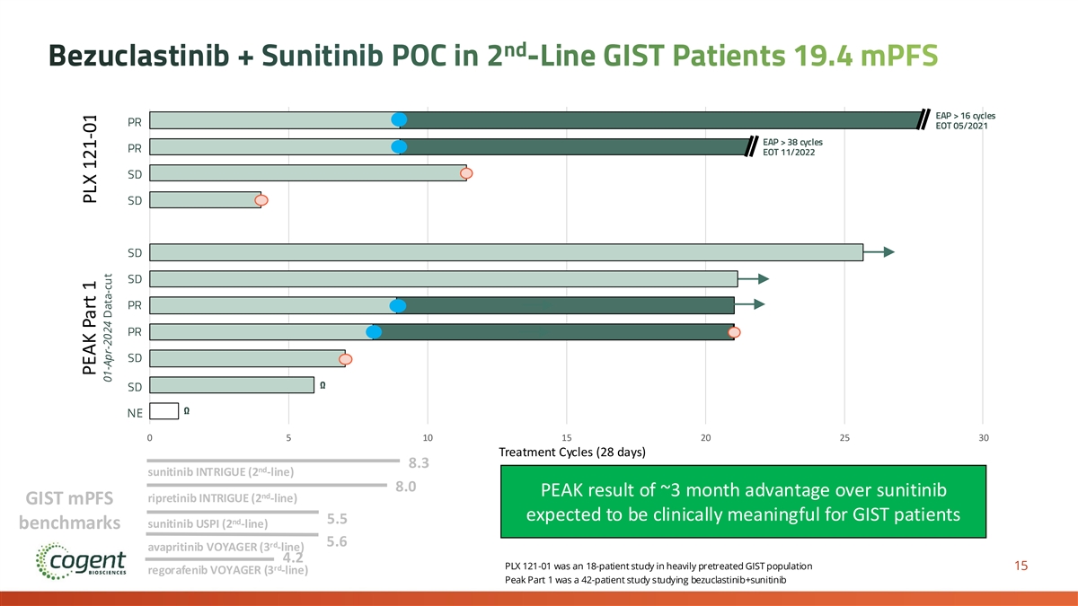 nd Bezuclastinib + Sunitinib POC in 2 -Line GIST Patients 19.4 mPFS EAP > 16 cycles PR EOT 05/2021 EAP > 38 cycles PR EOT 11/2022 SD SD SD SD PR PR SD Ω SD Ω NE 0 5 10 15 20 25 30 Treatment Cycles (28 days) 8.3 nd sunitinib INTRIGUE (2 -line) 8.0 PEAK result of ~3 month advantage over sunitinib nd ripretinib INTRIGUE (2 -line) GIST mPFS expected to be clinically meaningful for GIST patients nd 5.5 sunitinib USPI (2 -line) benchmarks 5.6 rd avapritinib VOYAGER (3 -line) 4.2 PLX 121-01 was an 18-patient study in heavily pretreated GIST population 15 rd regorafenib VOYAGER (3 -line) Peak Part 1 was a 42-patient study studying bezuclastinib+sunitinib PEAK Part 1 PLX 121-01 01-Apr-2024 Data-cut