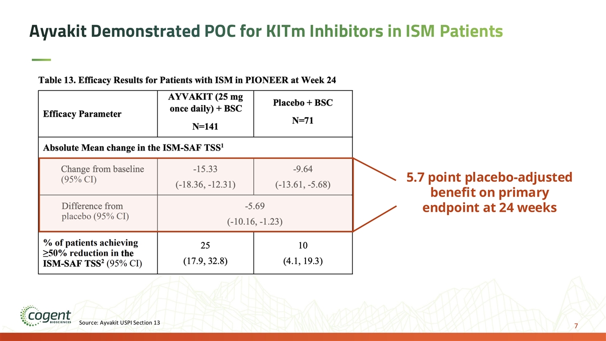 Ayvakit Demonstrated POC for KITm Inhibitors in ISM Patients 5.7 point placebo-adjusted benefit on primary endpoint at 24 weeks Source: Ayvakit USPI Section 13 7