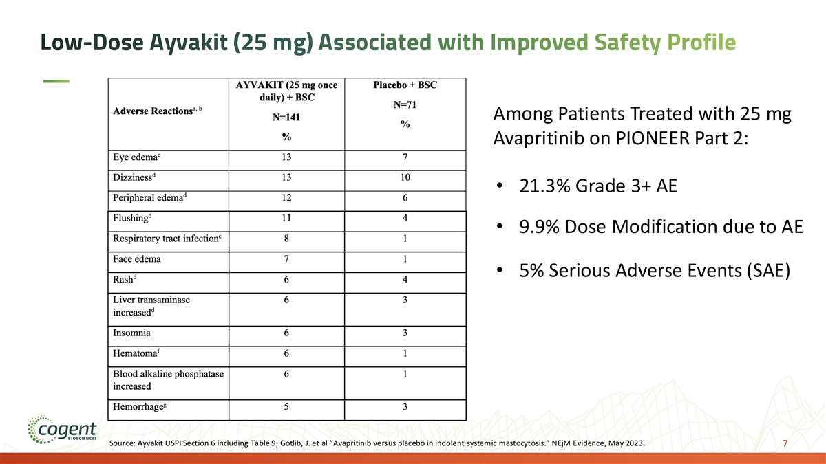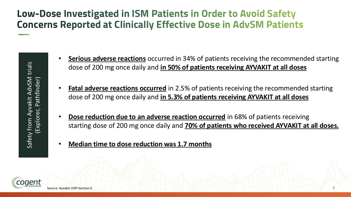 Low-Dose Investigated in ISM Patients in Order to Avoid Safety Concerns Reported at Clinically Effective Dose in AdvSM Patients • Serious adverse reactions occurred in 34% of patients receiving the recommended starting dose of 200 mg once daily and in 50% of patients receiving AYVAKIT at all doses • Fatal adverse reactions occurred in 2.5% of patients receiving the recommended starting dose of 200 mg once daily and in 5.3% of patients receiving AYVAKIT at all doses • Dose reduction due to an adverse reaction occurred in 68% of patients receiving starting dose of 200 mg once daily and 70% of patients who received AYVAKIT at all doses. • Median time to dose reduction was 1.7 months Source: Ayvakit USPI Section 6 7 Safety from Ayvakit AdvSM trials (Explorer, Pathfinder)