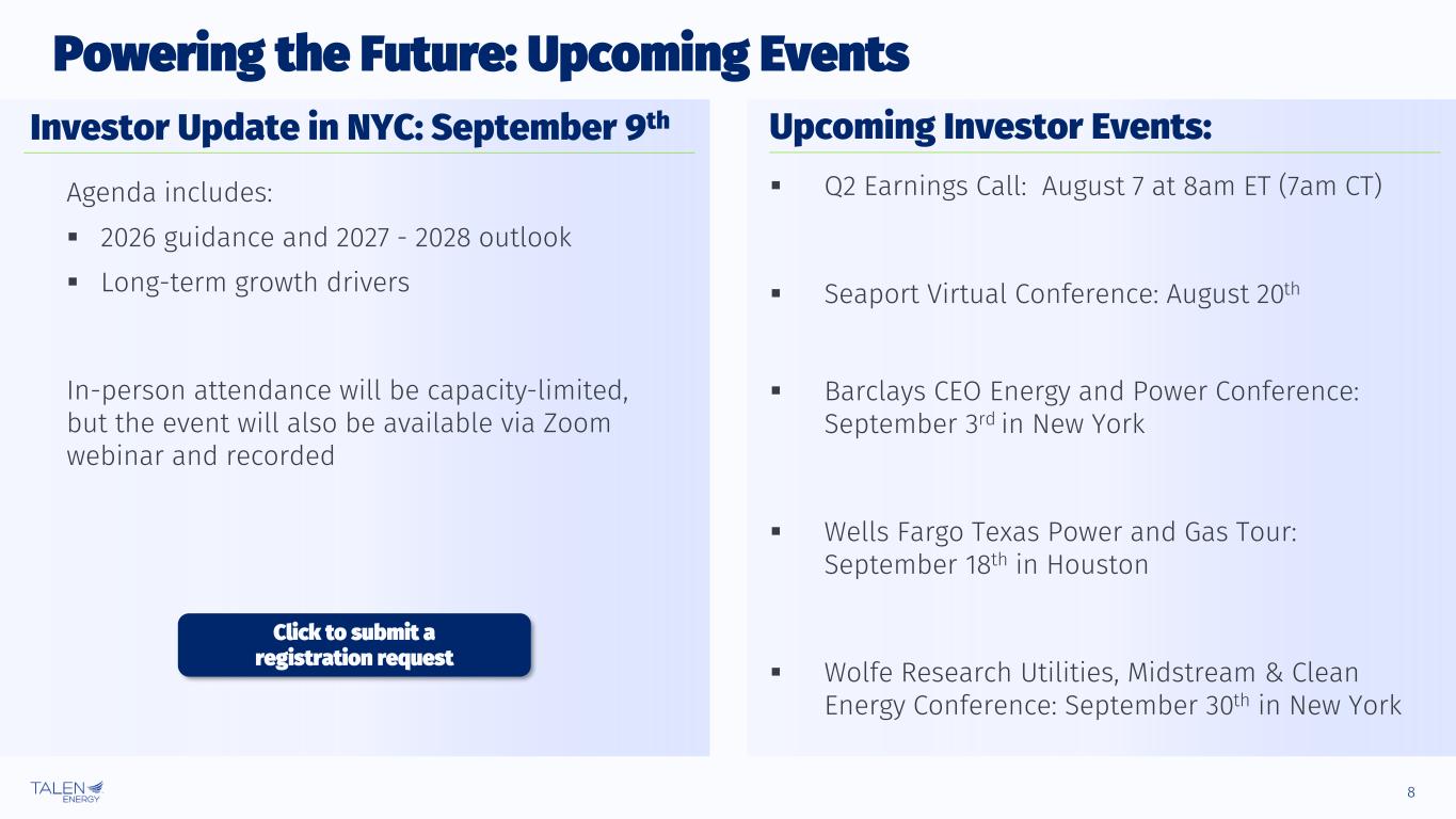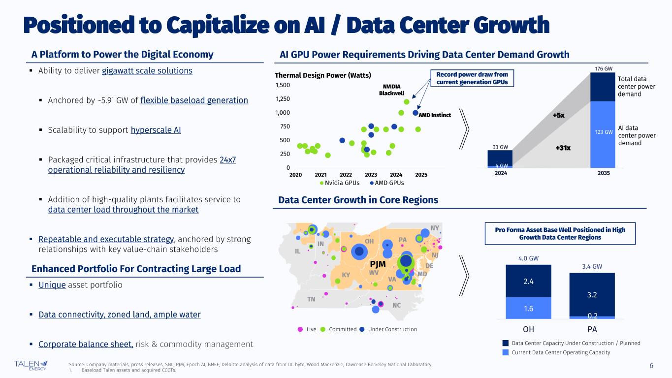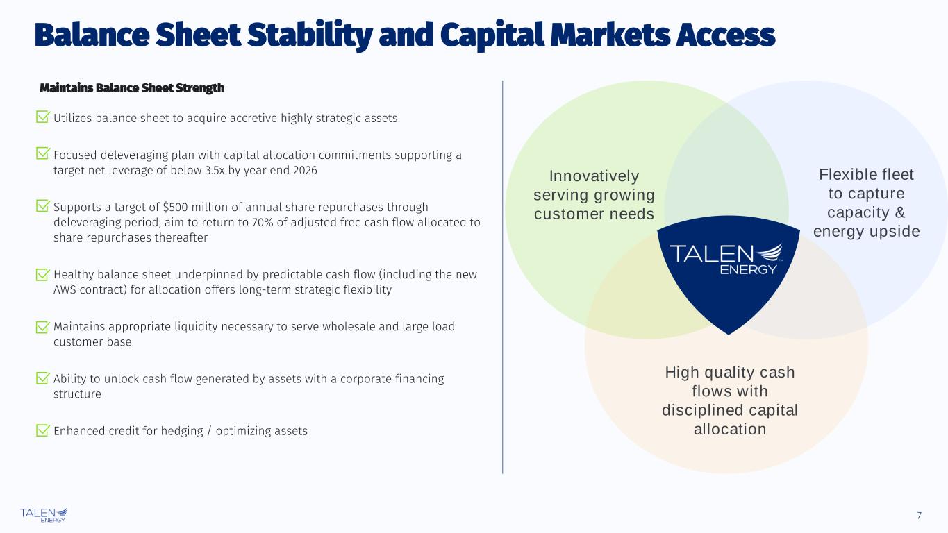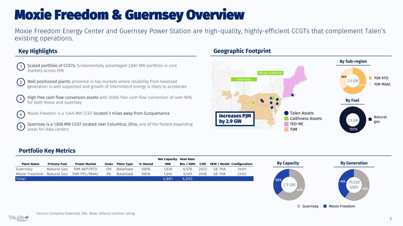 2 The information contained herein, as well as any information that has been supplied orally in connection herewith, speaks only as of the date of this presentation. Talen Energy Corporation (“Talen,” “TEC,” the “Company,” “we,” “our,” or “us”) and our affiliates and representatives expressly disclaim any obligation to update any information contained herein, whether as a result of new information or circumstances, future events or otherwise. The information contained herein is summary. For additional information, see the Company’s historical financial statements and other information included in its periodic reports and other filings with the Securities and Exchange Commission (the “SEC”) (available at www.sec.gov/edgar). Nothing contained herein should be construed as legal, business, tax, accounting or other professional advice, and you should consult your own advisors regarding such matters. These materials should not be relied upon for the maintenance of your books and records for any tax, accounting, legal or other procedures. Non-GAAP Financial Measures We include in this presentation Adjusted EBITDA and Adjusted Free Cash Flow, which we use as measures of our performance and liquidity, and which are not financial measures prepared under U.S. Generally Accepted Accounting Principles (“GAAP”). Non-GAAP financial measures, such as Adjusted EBITDA and Adjusted Free Cash Flow, do not have definitions under GAAP and may be defined differently by, and not be comparable to, similarly titled measures used by other companies or used in our credit facilities, the indentures governing our notes or any of our other debt agreements. Generally, a non-GAAP financial measure is a numerical measure of financial performance, financial position or cash flows that excludes (or includes) amounts that are included in (or excluded from) the most directly comparable measure calculated and presented in accordance with GAAP. Management cautions investors not to place undue reliance on such non-GAAP measures, but to consider them along with their most directly comparable GAAP measures. Adjusted EBITDA and Adjusted Free Cash Flow have limitations as analytical tools and should not be considered in isolation or as a substitute for analyzing our results as reported under GAAP. Due to the difficulty in predicting certain components of Adjusted EBITDA and Adjusted Free Cash Flow for Moxie Freedom and Guernsey with a reasonable degree of certainty, we are unable to reconcile these non-GAAP financial measures to the comparable GAAP measures without unreasonable efforts. Market and Industry Data This presentation includes market data and other information from independent industry publications, as well as surveys and our own research and knowledge of the industry. Some data is also based on management’s estimates, which are derived from our review of internal sources, as well as the independent sources described above. Although we believe these sources are reliable, the third-party information contained in this presentation has not been independently investigated, verified or audited and, therefore, we cannot guarantee the accuracy or completeness of such information. As a result, you should be aware that market share, ranking and other similar data set forth in this presentation, and estimates and beliefs based on such data, may not be reliable. Forward Looking Statements Statements contained in this presentation concerning expectations, beliefs, plans, objectives, goals, strategies, future events or performance, shareholder returns and underlying assumptions, and other statements that are not statements of historical fact are “forward-looking statements,” and should be considered estimates, assumptions or projections. These statements often include words such as “believe,” “expect,” “anticipate,” “intend,” “plan,” “estimate,” “target,” “project,” “forecast,” “seek,” “will,” “may,” “should,” “could,” “would” “goal”, “predict”, “continue”, “potential” or similar expressions. Any such forward-looking statements reflect various estimates and assumptions. Although we believe that the expectations and assumptions reflected in these statements are reasonable, there can be no assurance that they will prove to be correct. No representations or warranties are made by Talen or any of its affiliates, shareholders, directors, officers, employees, agents, partners or professional advisors as to the accuracy or achievability of any such forward-looking statements. Except as otherwise required by law, Talen undertakes no obligation to update any forward-looking statement to reflect new information or circumstances, future events or otherwise after the date on which such statement is made. Forward-looking statements are subject to many risks and uncertainties, and actual results may differ materially due to many factors. New factors emerge from time to time, and it is not possible for us to predict all of these factors. In addition to the specific factors discussed in the sections entitled “Cautionary Note Regarding Forward-Looking Information” and “Risk Factors” in our periodic reports and other filings with the SEC, the following are among the important factors that could cause actual results to differ materially from forward-looking statements: Talen’s or its subsidiaries’ levels of indebtedness; the terms and conditions of debt instruments that may restrict Talen’s ability to operate its business; operational, price and credit risks in the wholesale and retail electricity markets (including as a result of increases in the supply of electricity generally due to new power or intermittent renewable power generation); the effectiveness of Talen’s risk management techniques, including hedging, with respect to electricity and fuel prices, interest rates and counterparty and joint venture partner credit