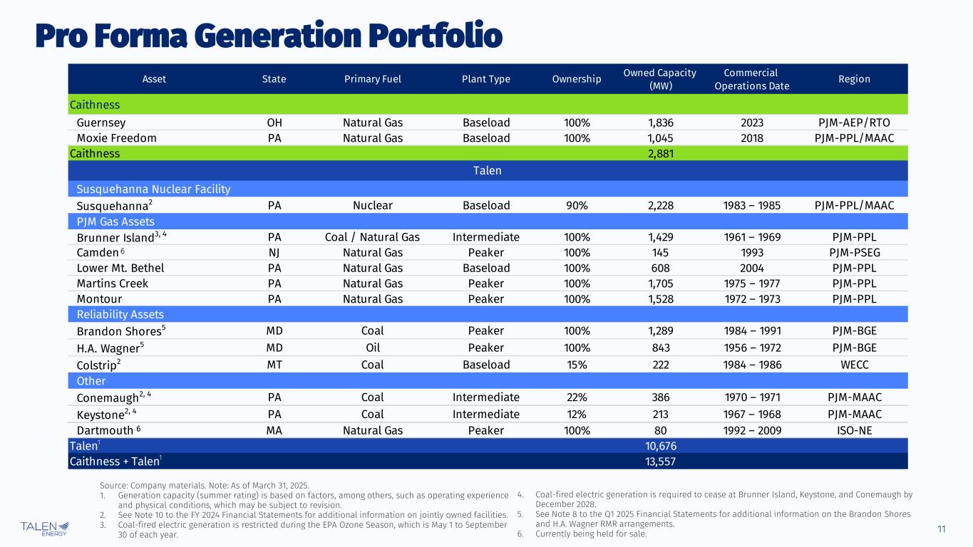 11 Asset State Primary Fuel Plant Type Ownership Owned Capacity  (MW) Commercial  Operations Date Region Caithness Guernsey OH Natural Gas Baseload 100% 1,836 2023 PJM-AEP/RTO Moxie Freedom PA Natural Gas Baseload 100% 1,045 2018 PJM-PPL/MAAC Caithness 2,881 Susquehanna Nuclear Facility Susquehanna2 PA Nuclear Baseload 90% 2,228 1983 – 1985 PJM-PPL/MAAC PJM Gas Assets Brunner Island3, 4 PA Coal / Natural Gas Intermediate 100% 1,429 1961 – 1969 PJM-PPL Camden NJ Natural Gas Peaker 100% 145 1993 PJM-PSEG Lower Mt. Bethel PA Natural Gas Baseload 100% 608 2004 PJM-PPL Martins Creek PA Natural Gas Peaker 100% 1,705 1975 – 1977 PJM-PPL Montour PA Natural Gas Peaker 100% 1,528 1972 – 1973 PJM-PPL Reliability Assets Brandon Shores5 MD Coal Peaker 100% 1,289 1984 – 1991 PJM-BGE H.A. Wagner5 MD Oil Peaker 100% 843 1956 – 1972 PJM-BGE Colstrip2 MT Coal Baseload 15% 222 1984 – 1986 WECC Other Conemaugh2, 4 PA Coal Intermediate 22% 386 1970 – 1971 PJM-MAAC Keystone2, 4 PA Coal Intermediate 12% 213 1967 – 1968 PJM-MAAC Dartmouth MA Natural Gas Peaker 100% 80 1992 – 2009 ISO-NE Talen 10,676 Caithness + Talen 13,557 Talen Pro Forma Generation Portfolio 4. Coal-fired electric generation is required to cease at Brunner Island, Keystone, and Conemaugh by  December 2028. 5. See Note 8 to the Q1 2025 Financial Statements for additional information on the Brandon Shores  and H.A. Wagner RMR arrangements. 6. Currently being held for sale. Source: Company materials. Note: As of March 31, 2025. 1. Generation capacity (summer rating) is based on factors, among others, such as operating experience  and physical conditions, which may be subject to revision. 2. See Note 10 to the FY 2024 Financial Statements for additional information on jointly owned facilities. 3. Coal-fired electric generation is restricted during the EPA Ozone Season, which is May 1 to September  30 of each year. 1 1 6 6