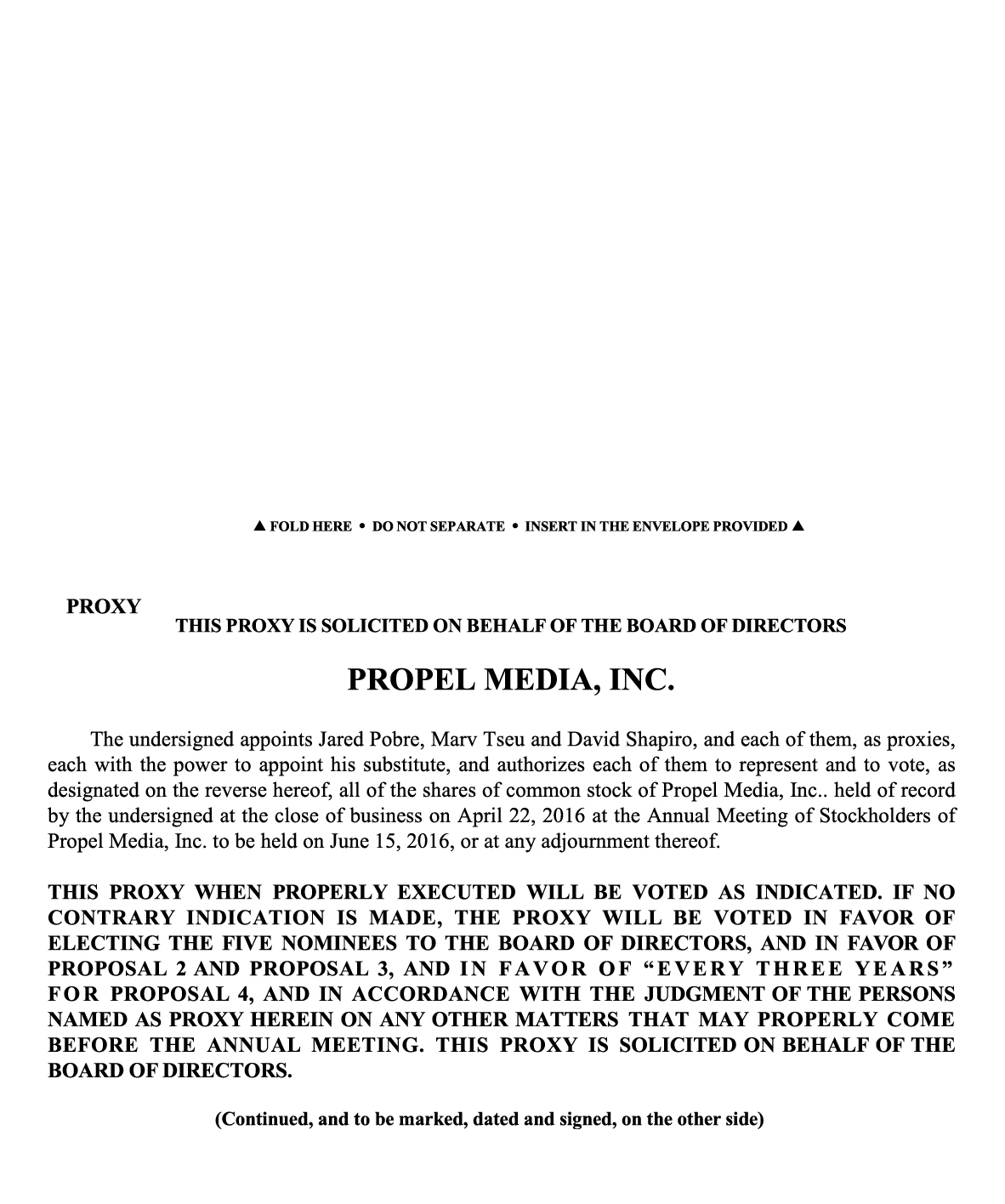 Important Notice Regarding the Availability of Proxy Materials for the Stockholder Meeting to be Held on June 15, 2014: The Company’s Proxy Statement and Annual Report on Form 10-K are available at https://www.propelmedia.com/investor-relations. |