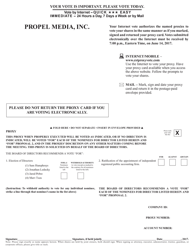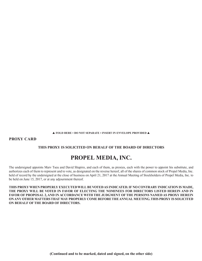 Important Notice Regarding the Availability of Proxy Materials for the Stockholder Meeting to be Held on June 15, 2017: The Company’s Proxy Statement and Annual Report on Form 10-K are available at https://www.propelmedia.com/company/investor/. |