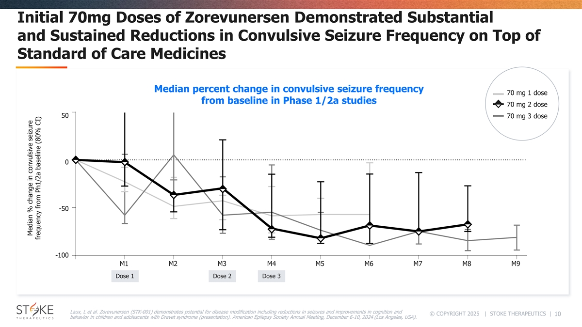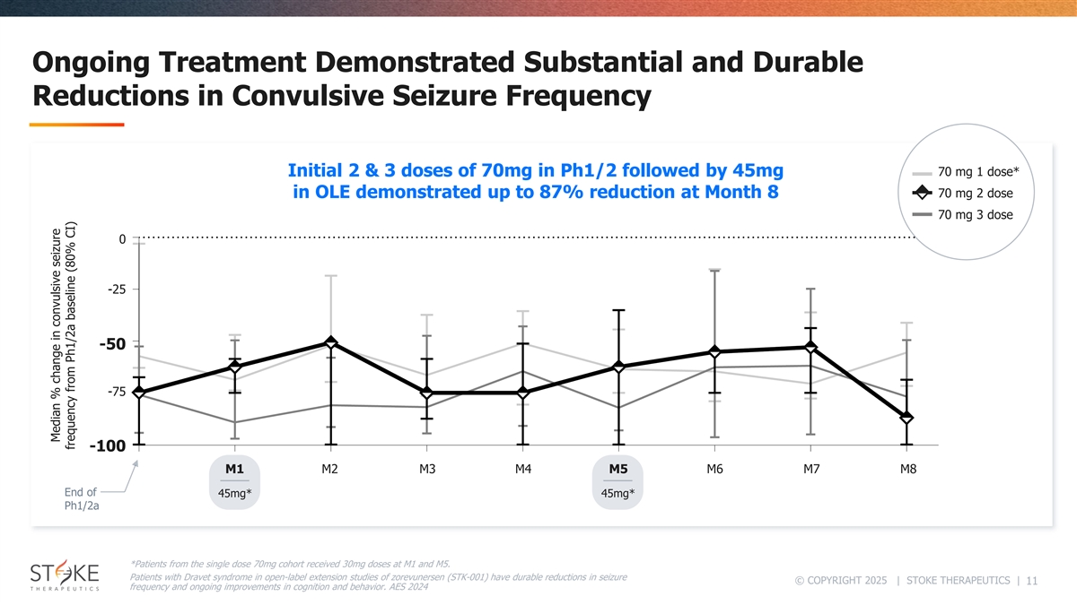 Initial 70mg Doses of Zorevunersen Demonstrated Substantial and Sustained Reductions in Convulsive Seizure Frequency on Top of Standard of Care Medicines Median percent change in convulsive seizure frequency 70 mg 1 dose from baseline in Phase 1/2a studies 70 mg 2 dose 50 70 mg 3 dose 0 ZZ -50 -100 M1 M2 M3 M4 M5 M6 M7 M8 M9 Dose 1 Dose 2 Dose 3 Laux, L et al. Zorevunersen (STK-001) demonstrates potential for disease modification including reductions in seizures and improvements in cognition and © COPYRIGHT 2025 | STOKE THERAPEUTICS | 10 behavior in children and adolescents with Dravet syndrome (presentation). American Epilepsy Society Annual Meeting, December 6-10, 2024 (Los Angeles, USA). Median % change in convulsive seizure frequency from Ph1/2a baseline (80% CI)