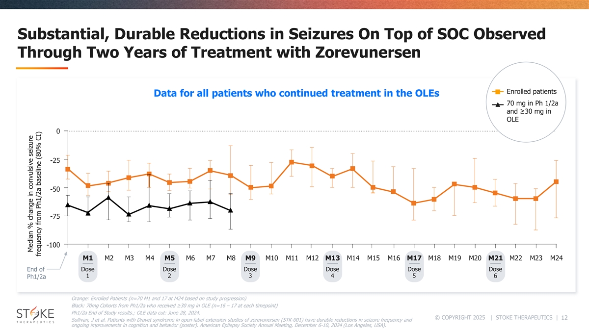Ongoing Treatment Demonstrated Substantial and Durable Reductions in Convulsive Seizure Frequency 70 mg 1 dose* Initial 2 & 3 doses of 70mg in Ph1/2 followed by 45mg 70 mg 2 dose in OLE demonstrated up to 87% reduction at Month 8 70 mg 3 dose 0 -25 ZZ -50 -75 -100 M1 M2 M3 M4 M5 M6 M7 M8 End of 45mg* 45mg* Ph1/2a *Patients from the single dose 70mg cohort received 30mg doses at M1 and M5. Patients with Dravet syndrome in open-label extension studies of zorevunersen (STK-001) have durable reductions in seizure © COPYRIGHT 2025 | STOKE THERAPEUTICS | 11 frequency and ongoing improvements in cognition and behavior. AES 2024 Median % change in convulsive seizure frequency from Ph1/2a baseline (80% CI)