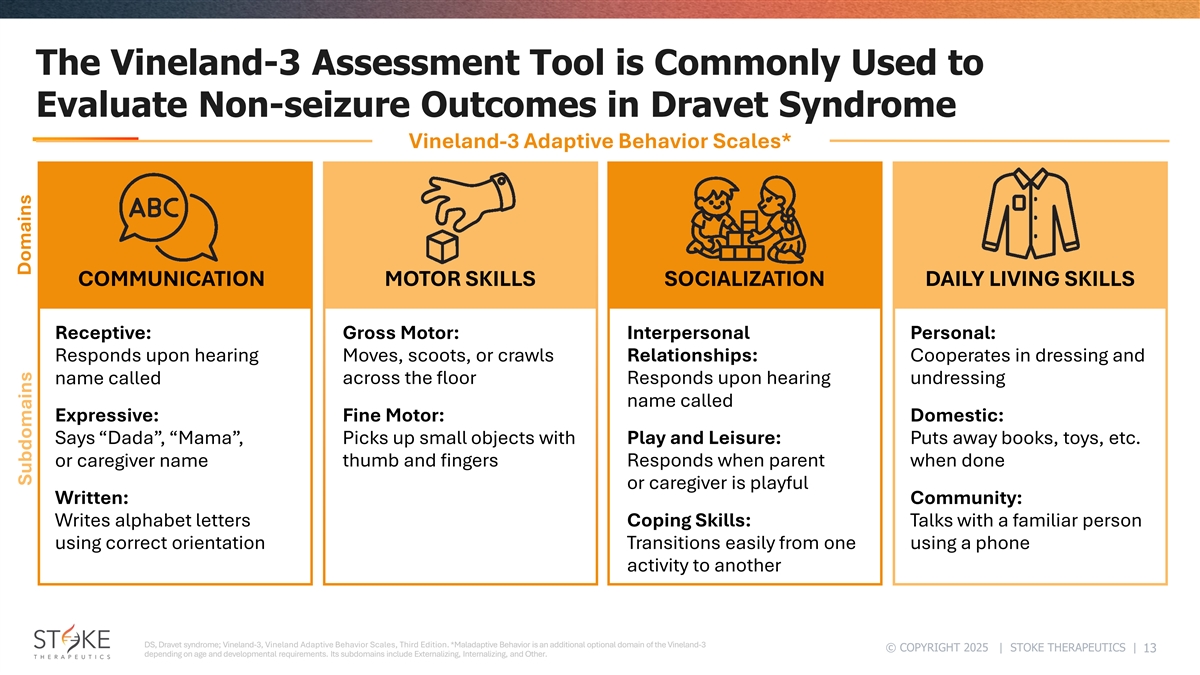 The Vineland-3 Assessment Tool is Commonly Used to Evaluate Non-seizure Outcomes in Dravet Syndrome Vineland-3 Adaptive Behavior Scales* COMMUNICATION MOTOR SKILLS SOCIALIZATION DAILY LIVING SKILLS Receptive: Gross Motor: Interpersonal Personal: Responds upon hearing Moves, scoots, or crawls Relationships: Cooperates in dressing and across the floor Responds upon hearing undressing name called name called Expressive: Fine Motor: Domestic: Says “Dada”, “Mama”, Picks up small objects with Play and Leisure: Puts away books, toys, etc. thumb and fingers Responds when parent when done or caregiver name or caregiver is playful Written: Community: Writes alphabet letters Coping Skills: Talks with a familiar person using correct orientation Transitions easily from one using a phone activity to another DS, Dravet syndrome; Vineland-3, Vineland Adaptive Behavior Scales, Third Edition. *Maladaptive Behavior is an additional optional domain of the Vineland-3 © COPYRIGHT 2025 | STOKE THERAPEUTICS | 13 depending on age and developmental requirements. Its subdomains include Externalizing, Internalizing, and Other. Subdomains Domains