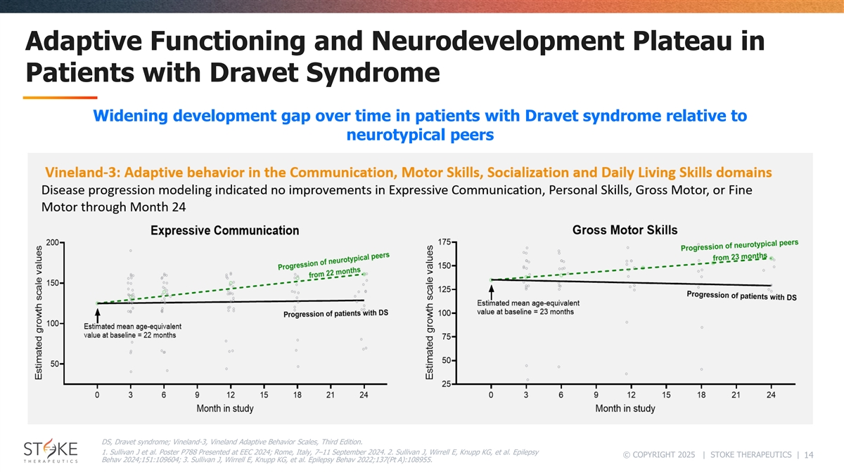 Adaptive Functioning and Neurodevelopment Plateau in Patients with Dravet Syndrome Widening development gap over time in patients with Dravet syndrome relative to neurotypical peers DS, Dravet syndrome; Vineland-3, Vineland Adaptive Behavior Scales, Third Edition. 1. Sullivan J et al. Poster P788 Presented at EEC 2024; Rome, Italy, 7–11 September 2024. 2. Sullivan J, Wirrell E, Knupp KG, et al. Epilepsy © COPYRIGHT 2025 | STOKE THERAPEUTICS | 14 Behav 2024;151:109604; 3. Sullivan J, Wirrell E, Knupp KG, et al. Epilepsy Behav 2022;137(Pt A):108955.